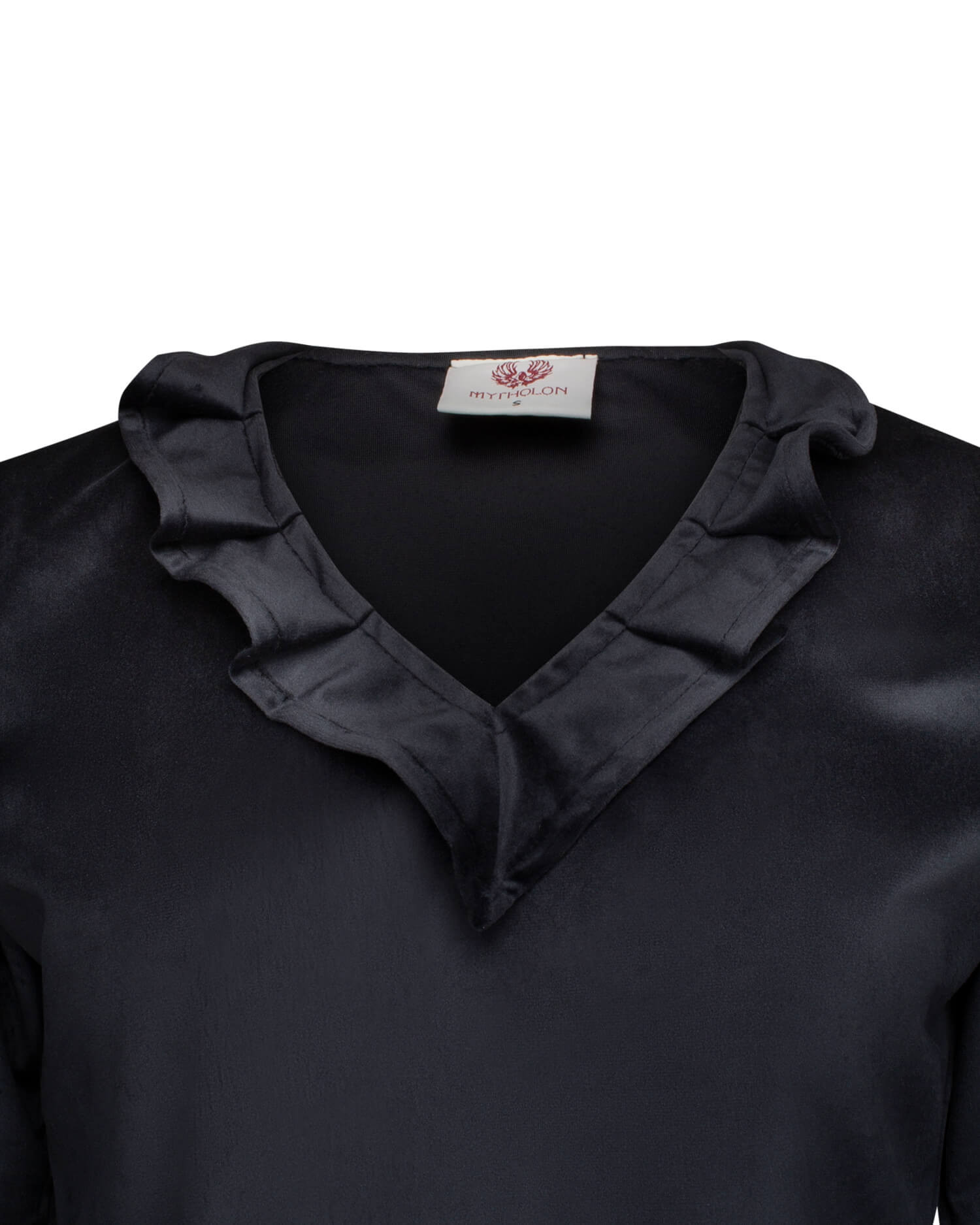 Its design, with a V-shaped neckline and a delicate ruffle at the edge, adds a sophisticated touch that does not go unnoticed. The long sleeves, fitted at the bottom, offer a polished finish that adapts to any occasion, whether it's a formal event or a casual gathering with friends.