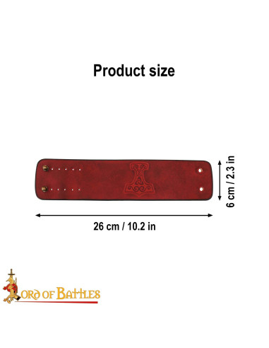 Medieval leather bracelet with Thor's hammer embossed design, garnet color