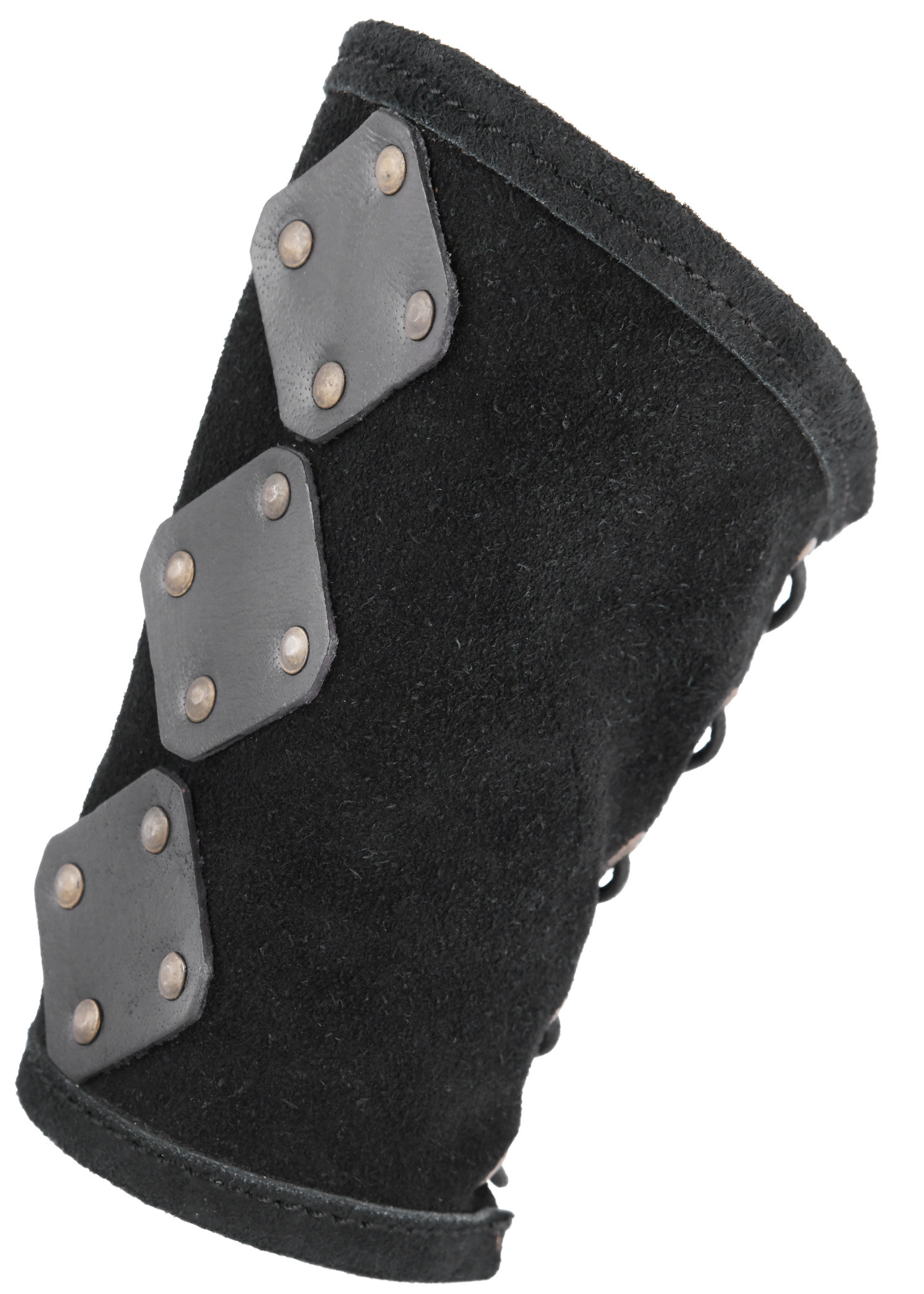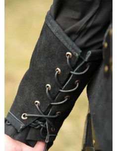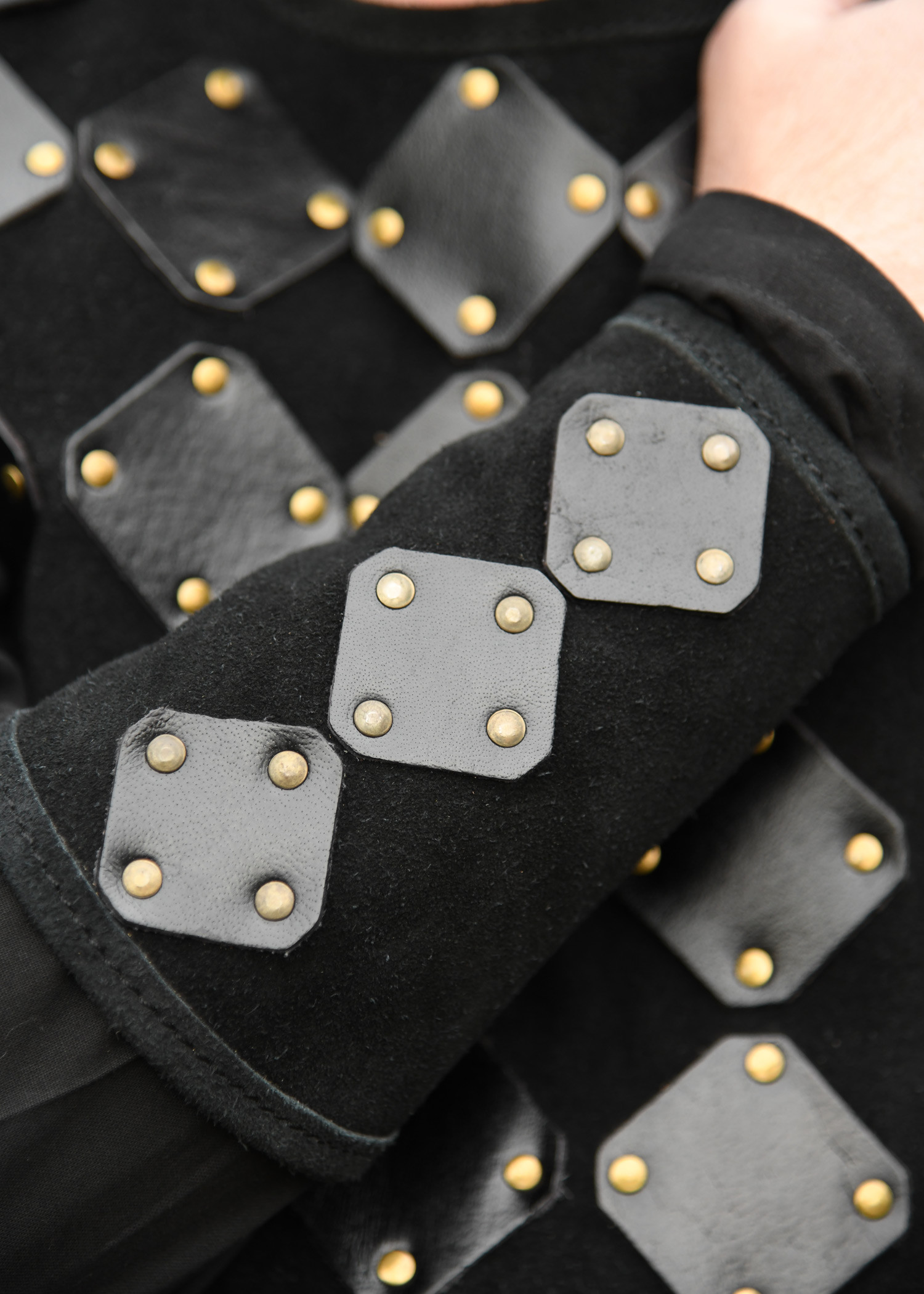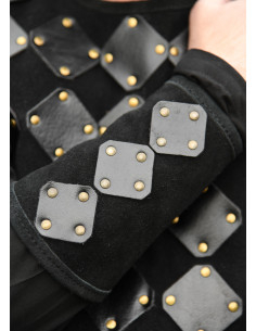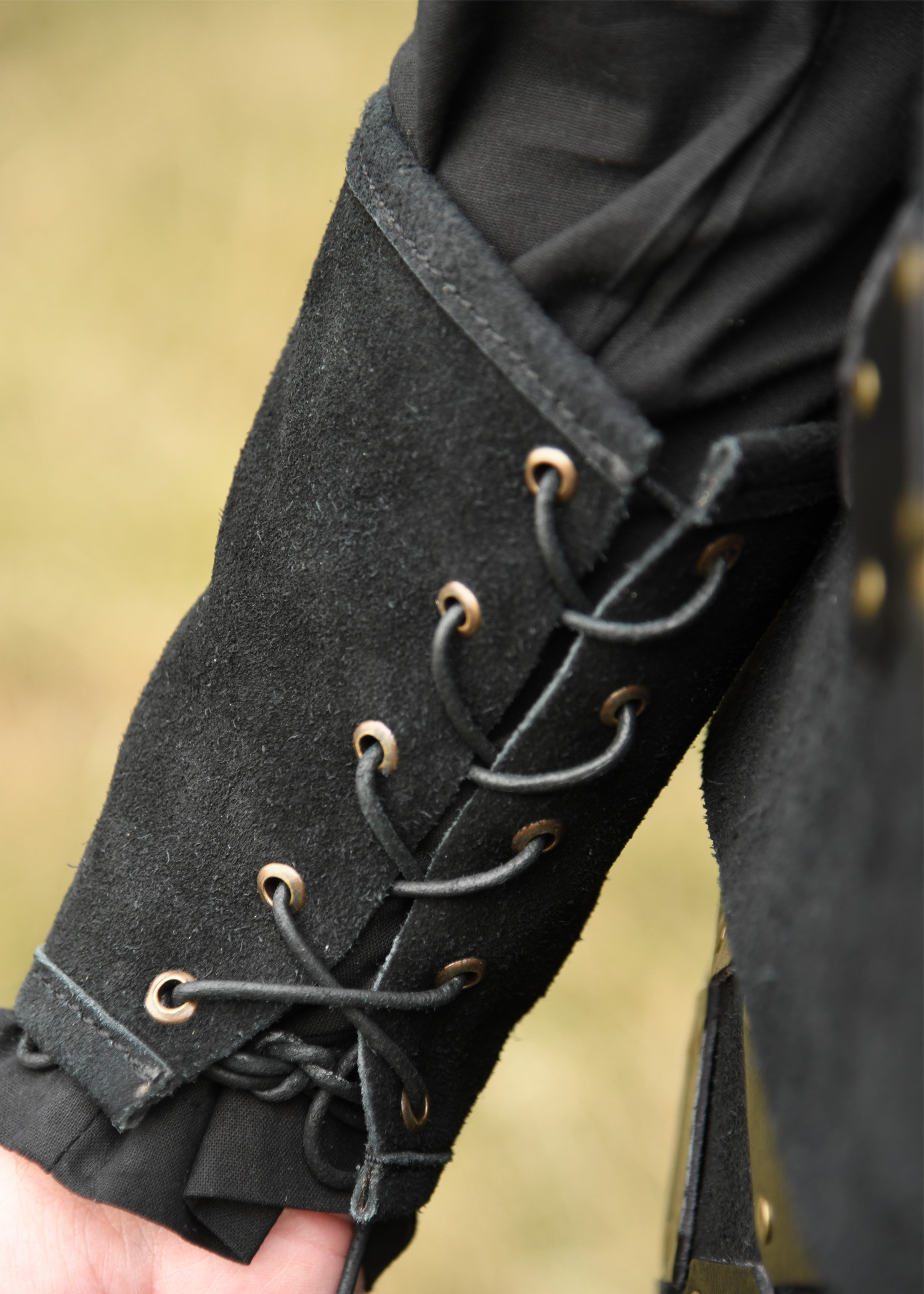 Crafted from soft black suede with vegetable tanning, the bracelet is adorned with three riveted plates made of durable grain leather. Its design features a lacing system that allows for a customized fit, ensuring a secure and comfortable wear. The softness and flexibility of the suede guarantee that the bracelet fits perfectly on the arm without restricting your movements, maintaining comfort even during long hours of use, such as at a medieval market.