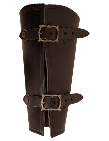 Crafted from genuine black leather, they feature a smooth finish and craftsmanship that speaks for itself, with white stitching tracing a careful pattern and reinforcing the most exposed areas, offering a sensation of durability and character from the very first gesture. Their multi-piece construction adapts to the contour of the forearm, achieving a snug fit without limiting movement, ideal for historical reenactments, cosplay, or themed events where mobility and appearance matter equally.