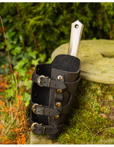 Each bracer is handmade in Spain, crafted from high-quality leather and reinforced with bronze fittings that strengthen the surface without limiting your movements, allowing for agile maneuvers and confidence in gaming or historical reenactment situations. The polished and waxed edges protect the leather and ensure comfortable wear over a tunic or directly on the arm.