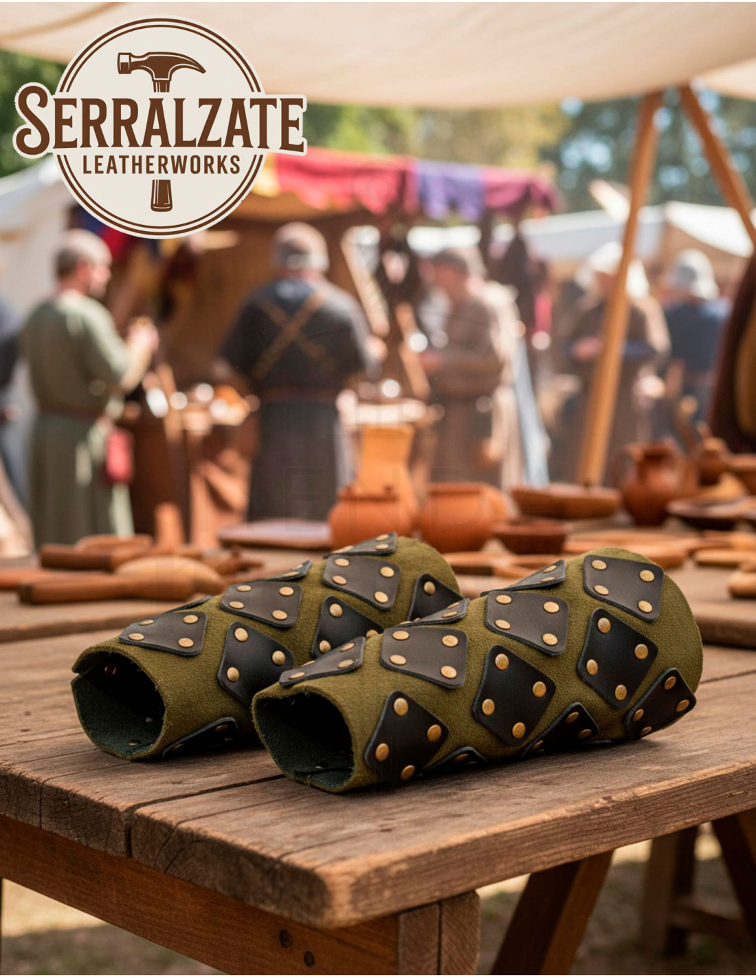 These bracers combine the warmth and flexibility of olive green felt or wool with the durability of diamond-shaped leather plates, creating a barrier that absorbs chafing and impacts without limiting your actions. The brass-riveted scale reinforcement adds localized protection and a finish that evokes the texture of natural armor, perfect for those who need to defend themselves without losing agility.