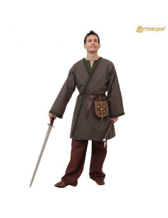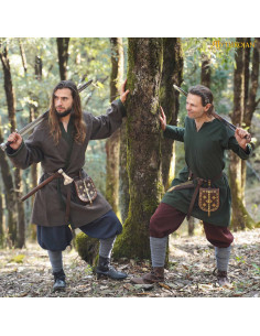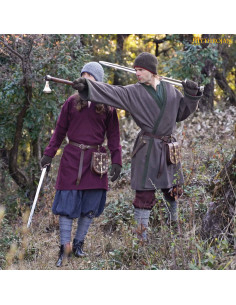 Its wide and flowing cut, with wide sleeves and a 'V' neckline, ensures optimal mobility and a perfect fit over tunics or other medieval garments. The green finishes on the collar and sleeves enhance the design, while the brown leather belt with a metal buckle completes its traditional style, adding a firm and comfortable fit. Crafted from a dense medium-weight fabric, this coat guarantees insulation and comfort in cold climates, making it perfect for prolonged outdoor events.