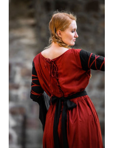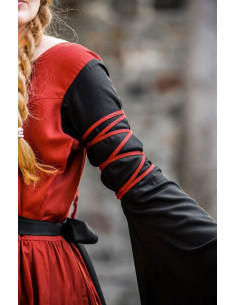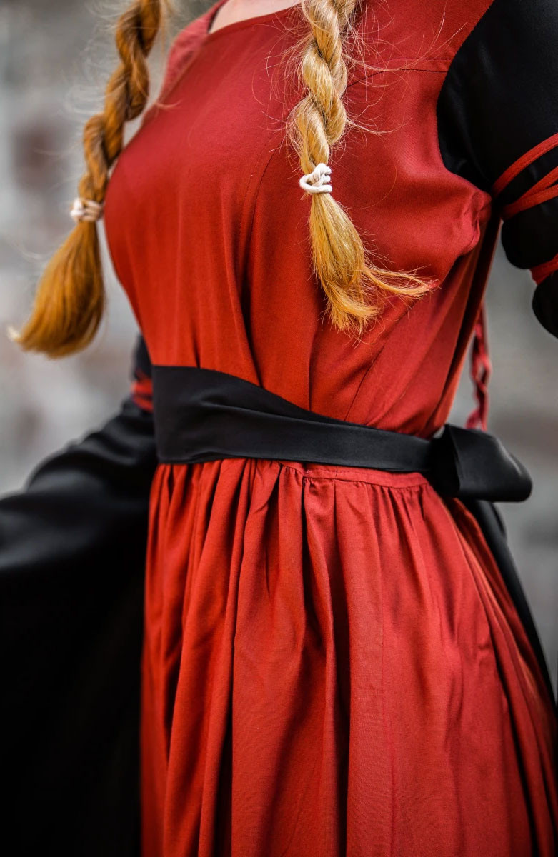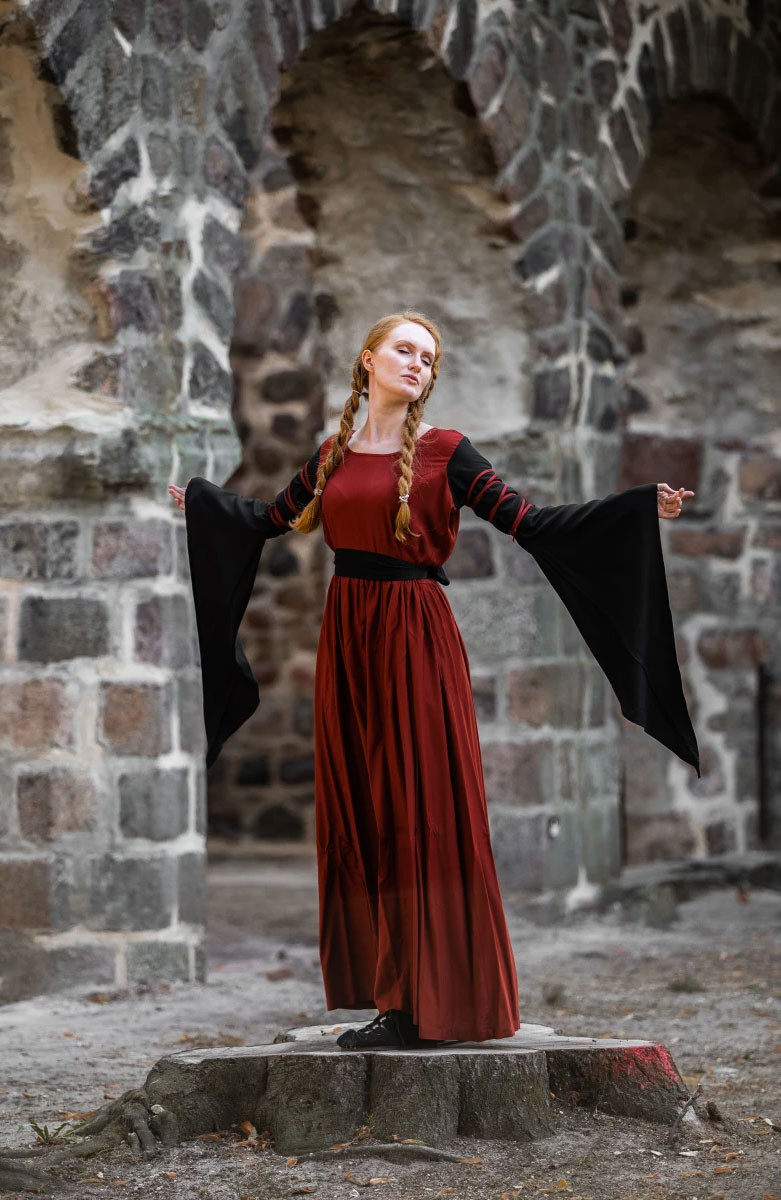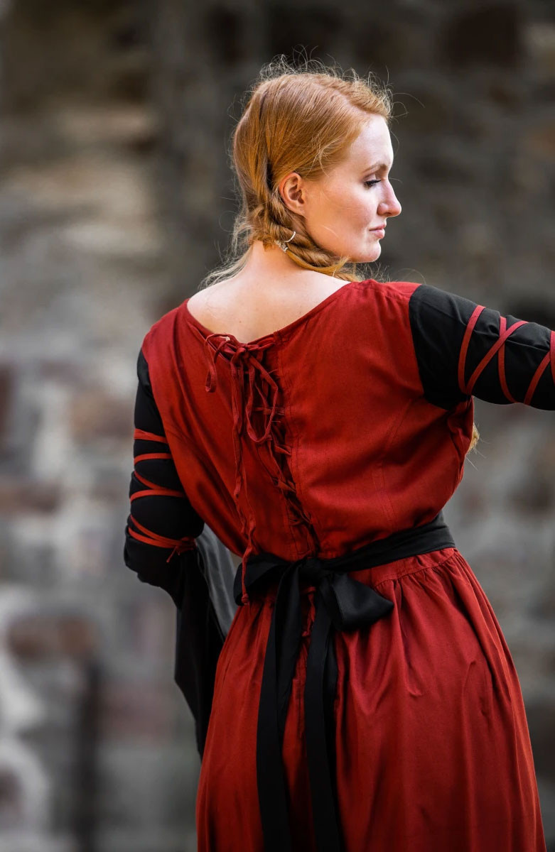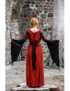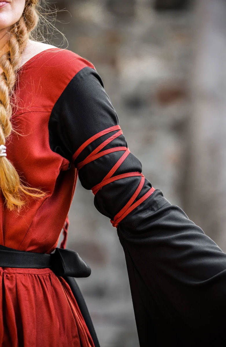 Transport your style to the medieval world with our beautiful red and black Dorell dress! This dress is perfect for any lover of medieval fashion, with its unique and attractive design that will surely catch everyone's eyes. Its trumpet sleeves add a touch of elegance and distinction, while its 100% viscose construction makes it soft and comfortable to wear.