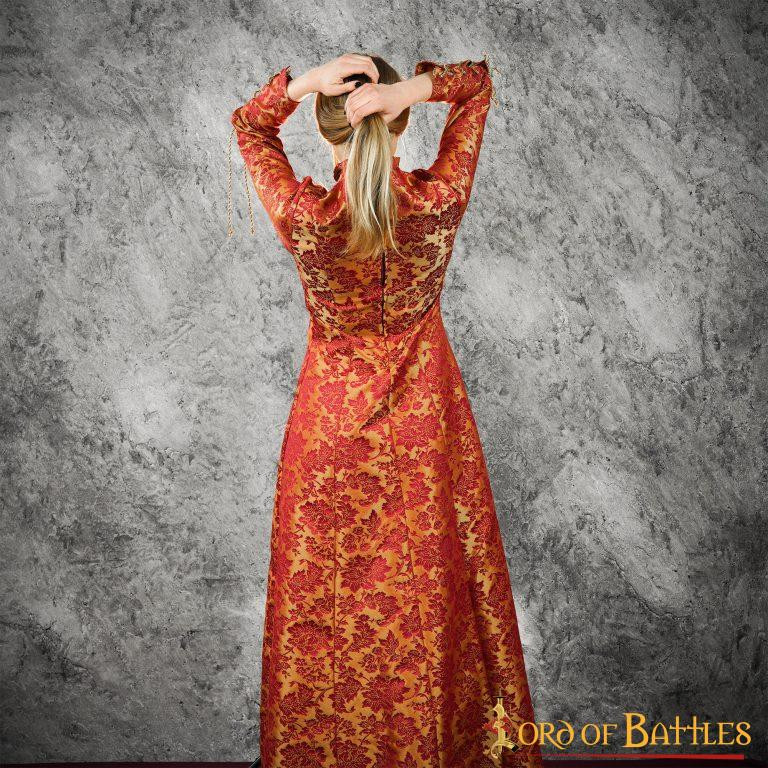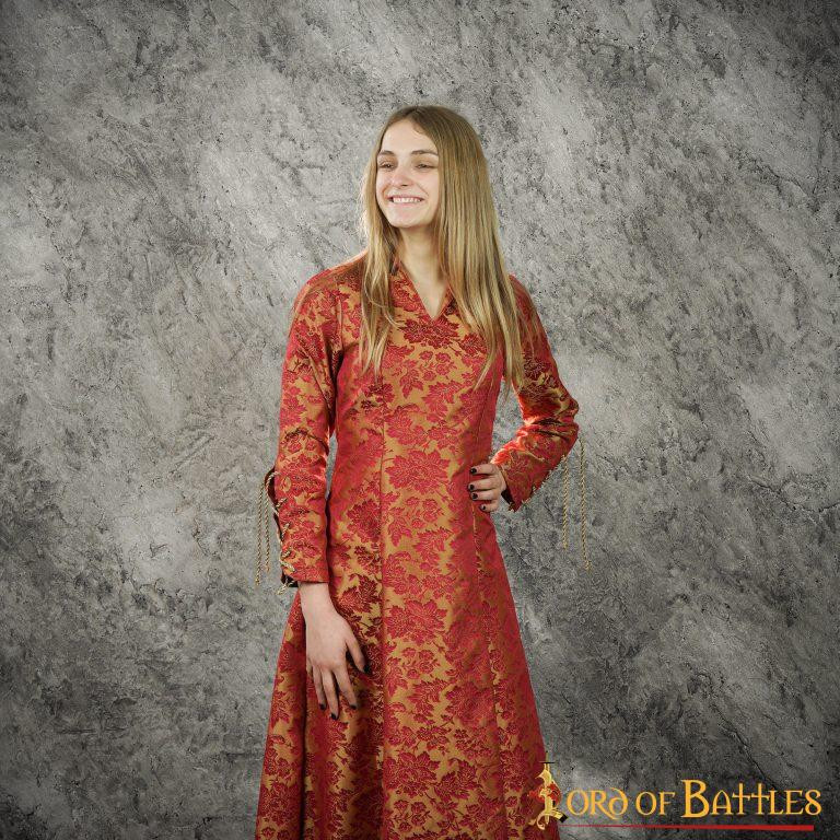 Look regal and elegant in your medieval celebrations with the courtly woman medieval dress with brocades! This beautiful maroon-colored dress is designed to highlight your figure and transport you to the courtly era.
