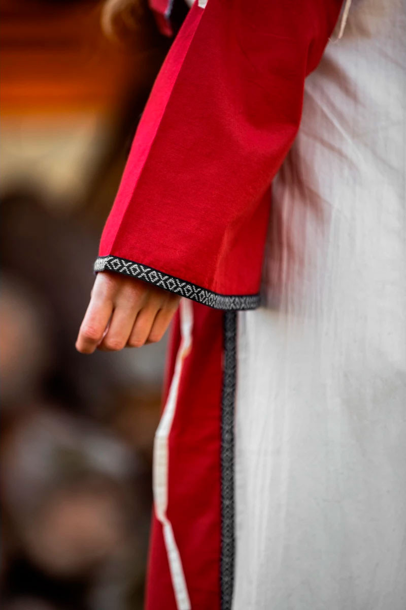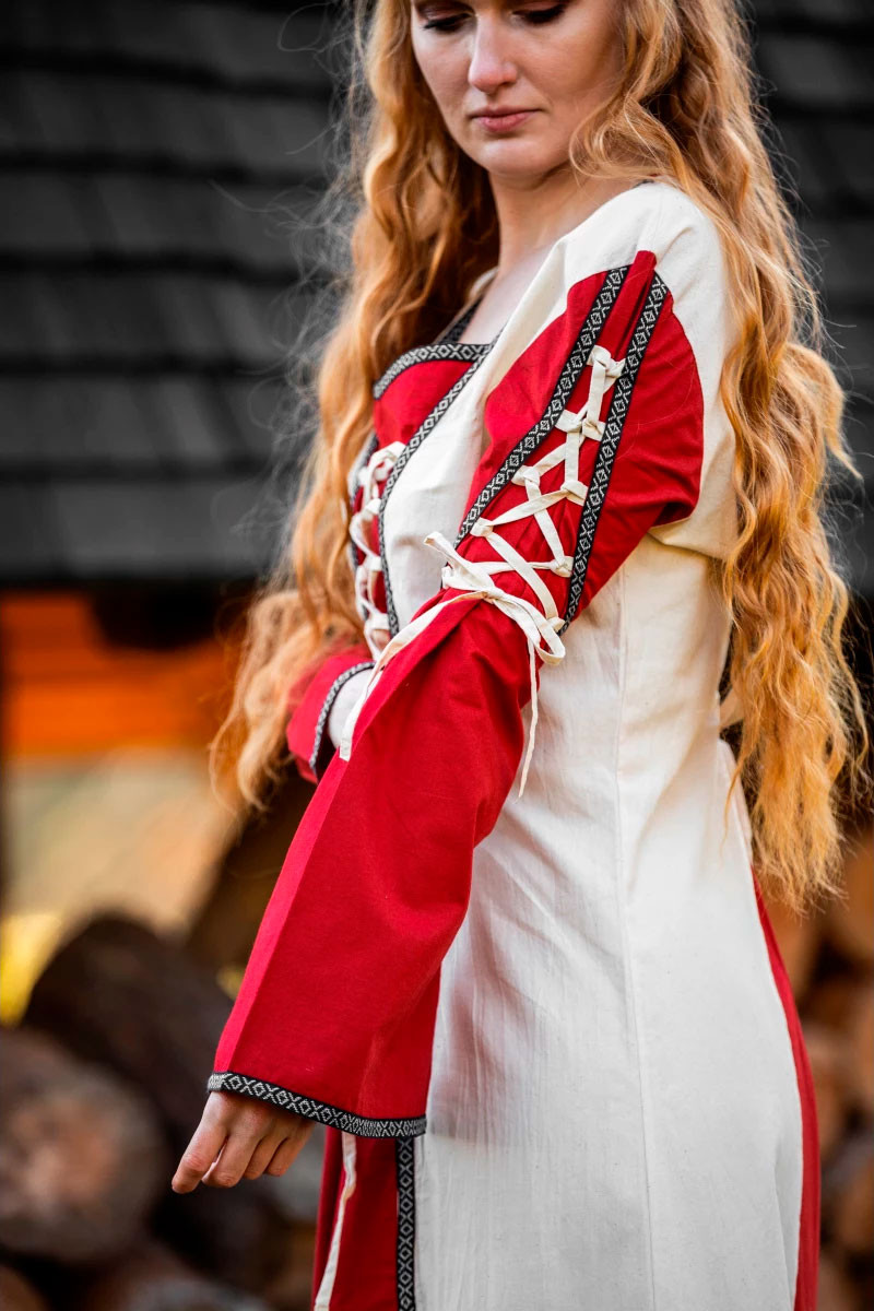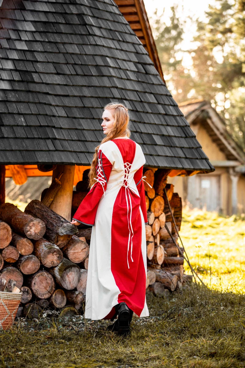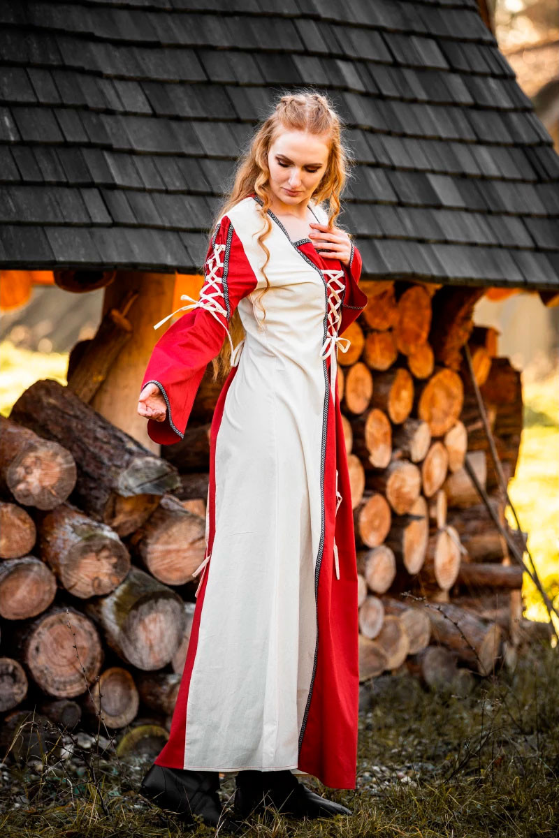 The Amalia Medieval Dress in Natural-Red is a true work of art that is sure to capture the attention of all historical style enthusiasts. Its two-tone design, with a delicate border and bow details on the front, back and sleeves, exudes elegance and femininity.
