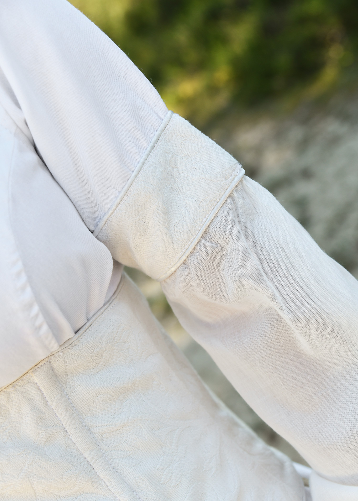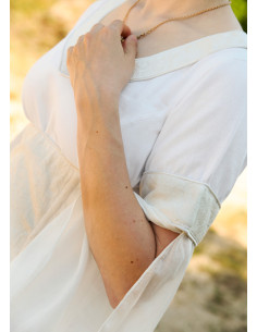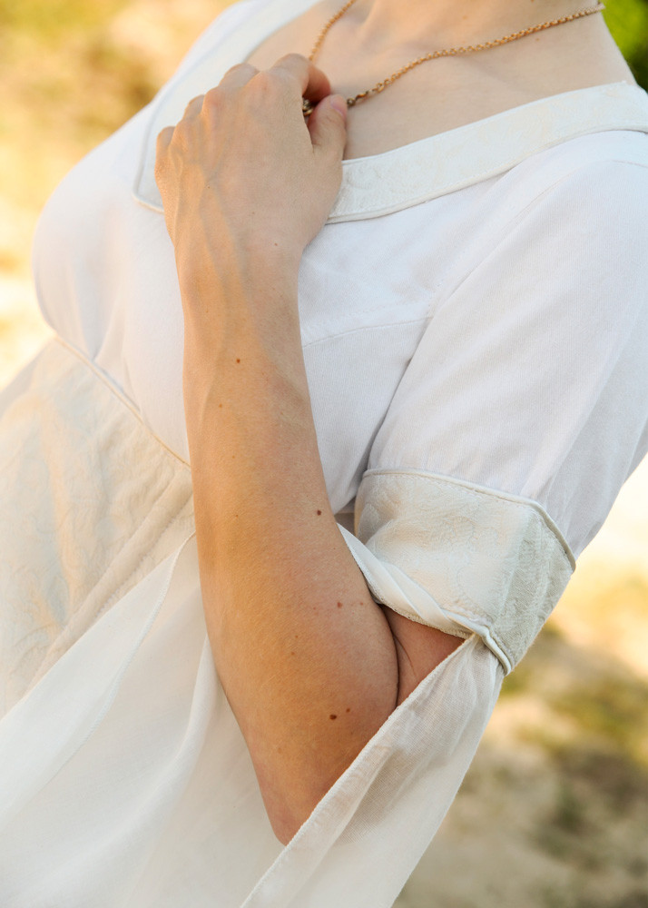 Predominantly white, this dress has cream details at the neckline, sleeves, and laces, subtly and elegantly complementing the overall aesthetic. The bodice, also in cream, adds a touch of distinction to the ensemble. Three different types of cotton fabrics have been used: flowing batiste for the sleeves, white twill for the body of the dress, and printed damask for the details and bodice. Additionally, the edges are finished with a fine satin ribbon, adding a touch of luxury.