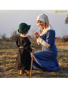 Are you looking for a dress that transports your imagination to medieval Europe, specifically the 14th and 15th centuries? This linen dress inspired by the kirtles of the era is perfect for achieving an authentic and versatile look. With its long, seamless waist design, it easily fits the body and closes with laces at the front, allowing for a personalized and comfortable fit. Its short sleeves and 150 gsm linen fabric in an elegant blue tone offer a fresh, natural feel—ideal for reenactments, LARP events, or creating historical characters.