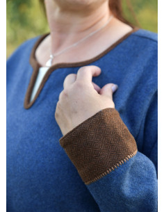 The Historical Blue Brown Viking Dress Lykka Wool draws inspiration from archaeological findings and transforms it into a garment made to be lived in, not just to be admired. The integrated wool fabric offers natural warmth and a drape that elegantly envelops, allowing you to move freely while preserving the authentic silhouette of the era.