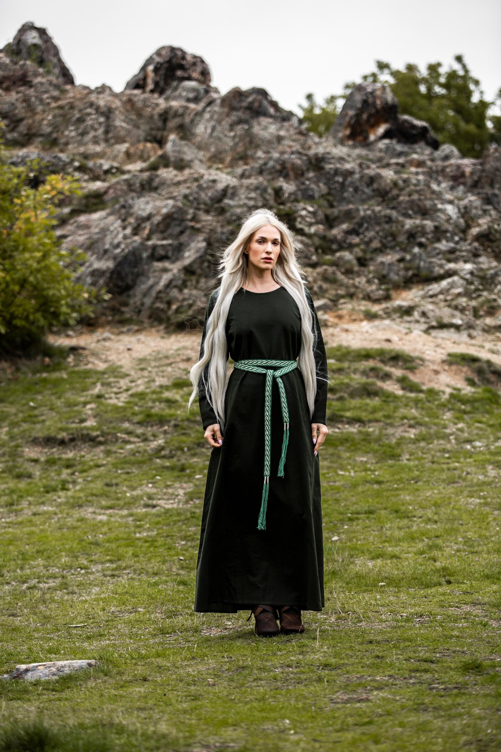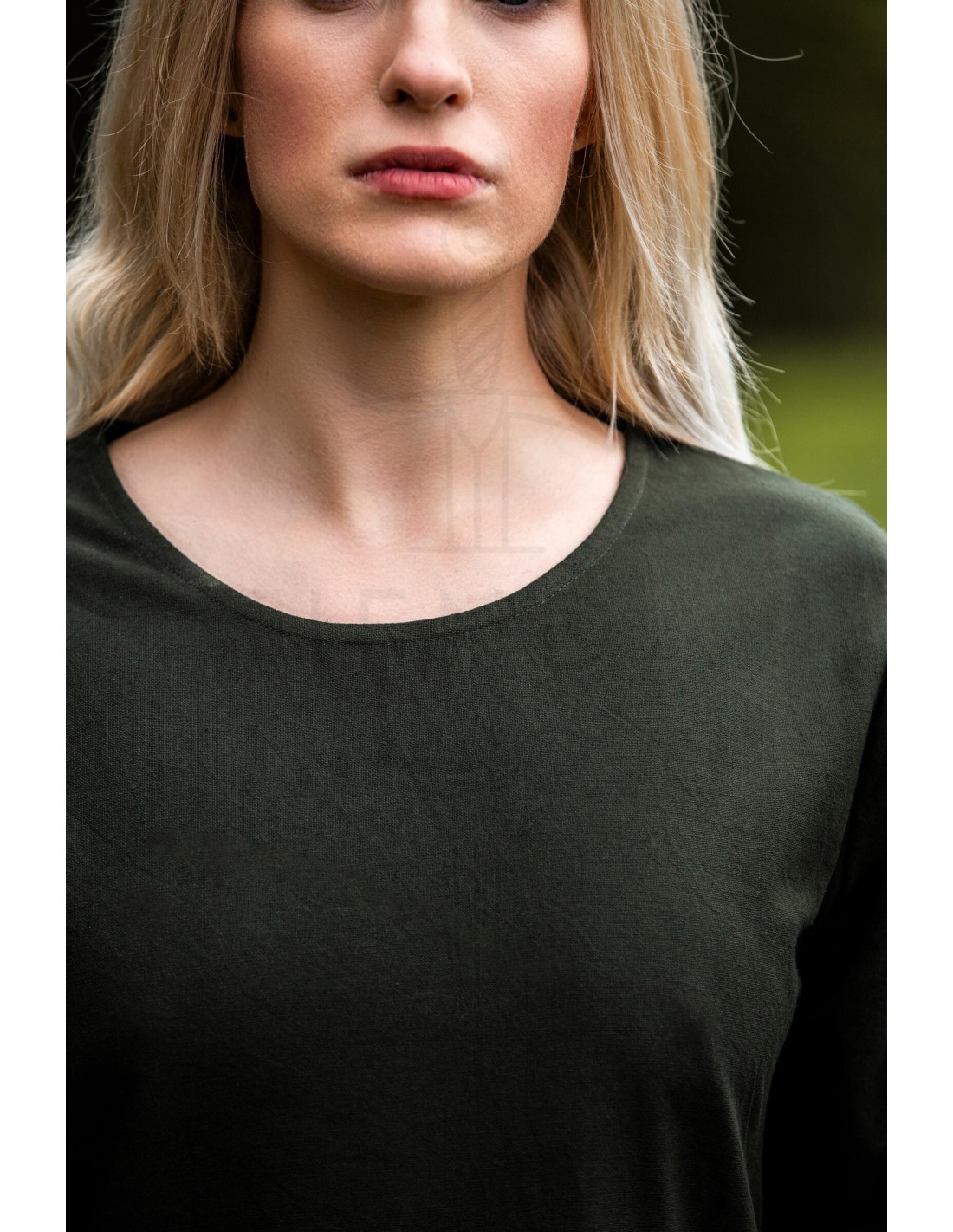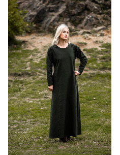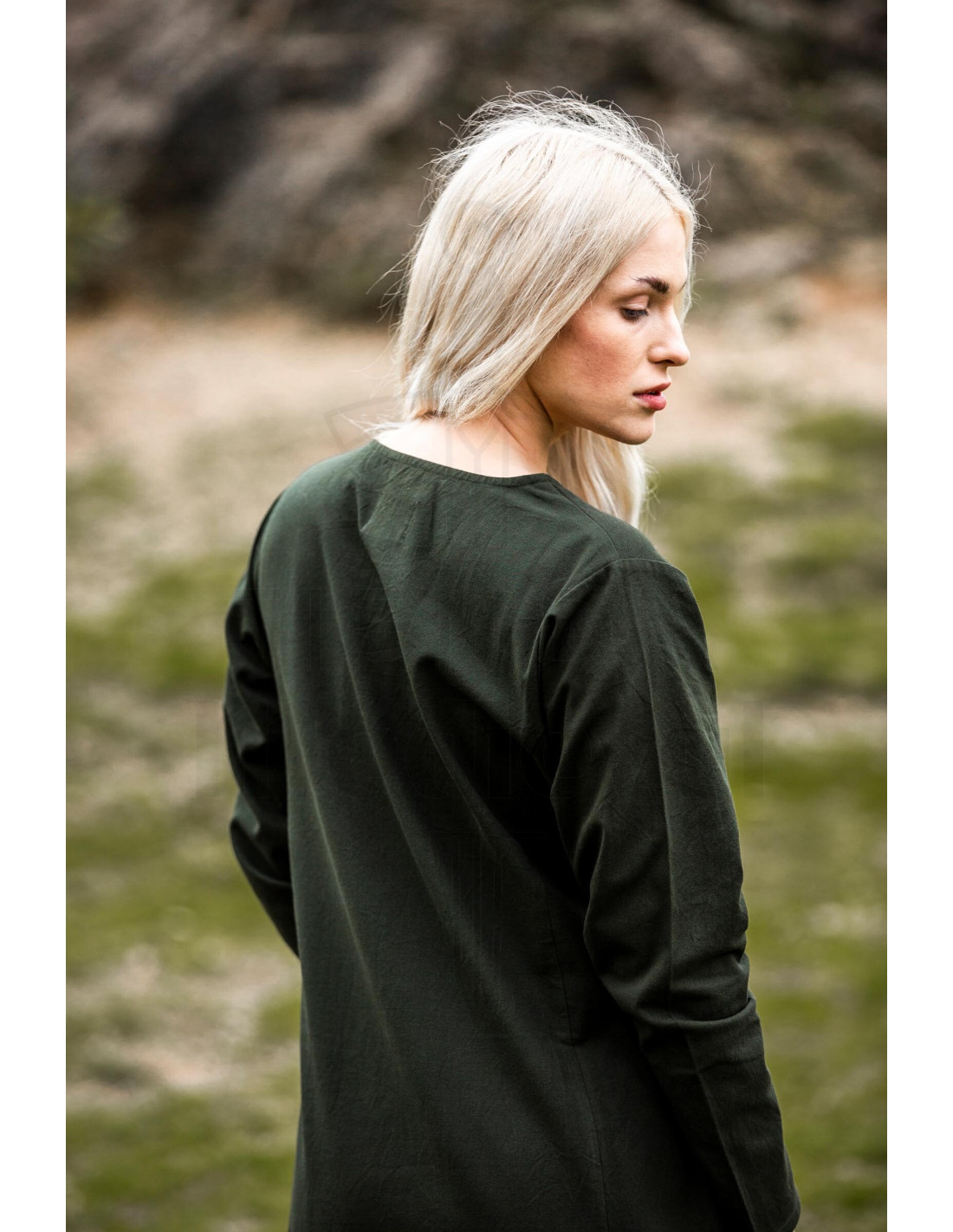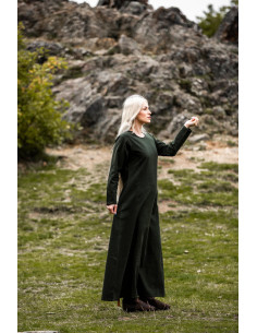 The Medieval Dress Alvilda with Round Neck, Green features a straight and loose silhouette that promotes freedom of movement, allowing you to walk, take part in reenactments, or enjoy an event with complete comfort. The ankle-length cut creates an elegant fall, while the long sleeves provide a serene warmth, perfect for changing days.
