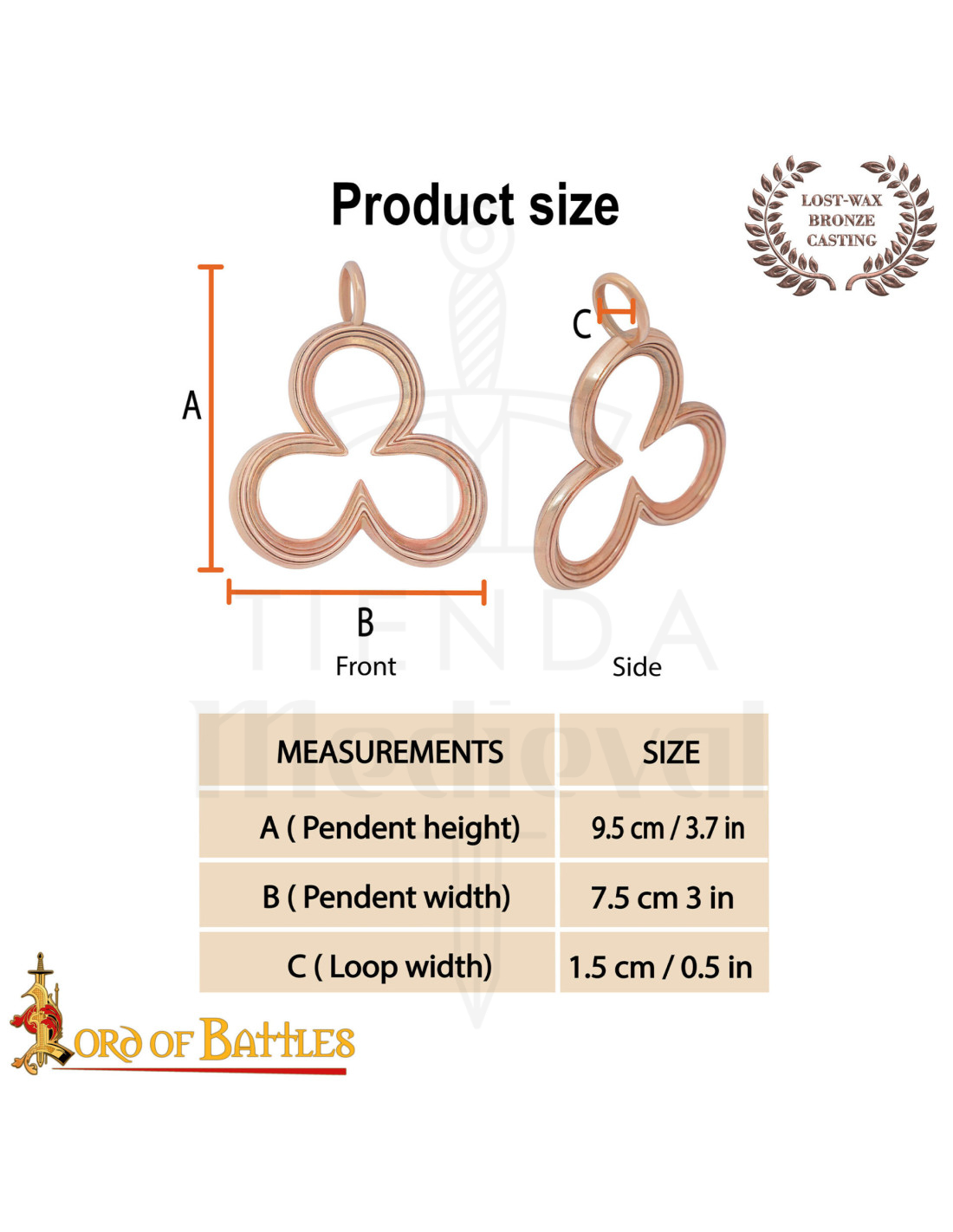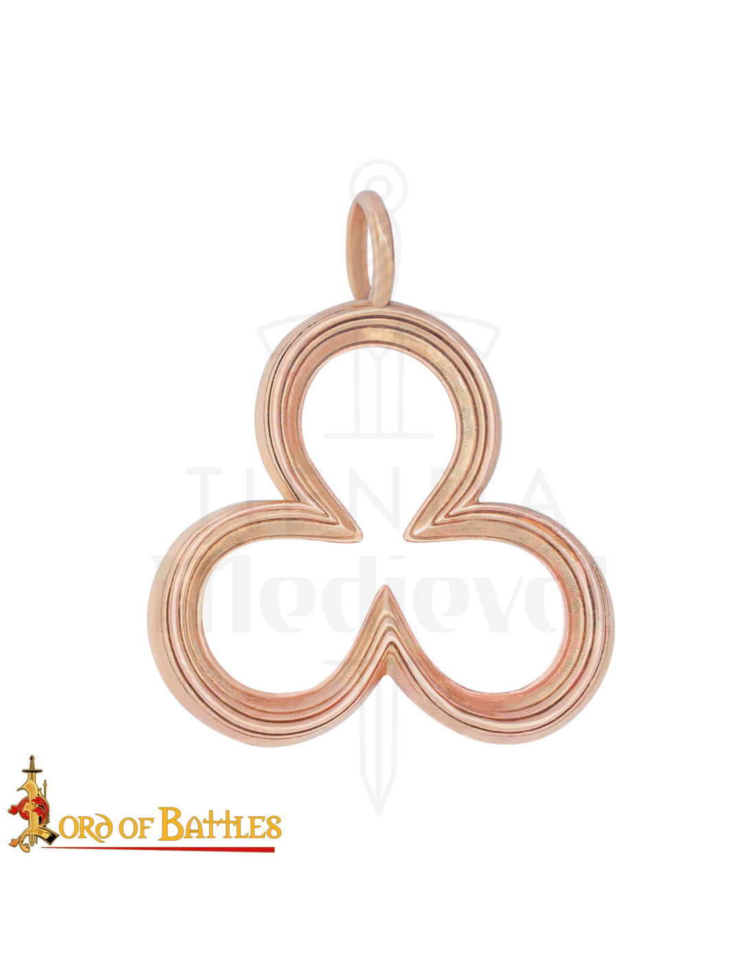 Forged using the traditional lost-wax casting technique, the pendant features a solid surface and a natural finish that adds a historic character without sacrificing the durability needed for daily wear or live events. The embossed lines follow the silhouette of the four-leaf clover, creating a depth effect that captures light and enhances its golden copper tone, making it perfect to pair with tunics, period garments, or contemporary styles.