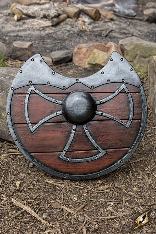 With a waning moon shape and a hand-painted steel rim, this shield not only gives you protection, but also makes you look impressive on the battlefield. In addition, it has a head of shield and a Maltese cross, which add a touch of elegance and distinction.