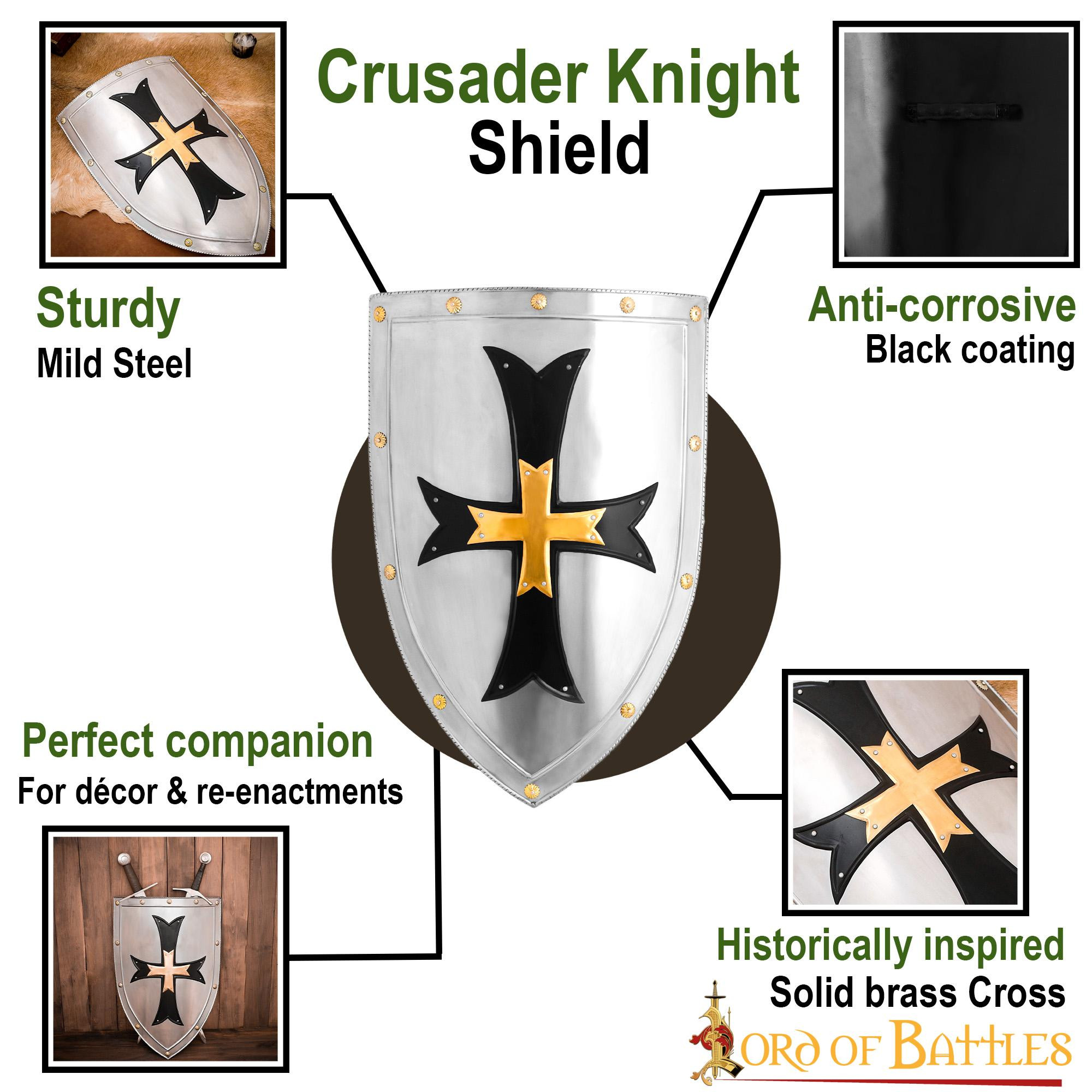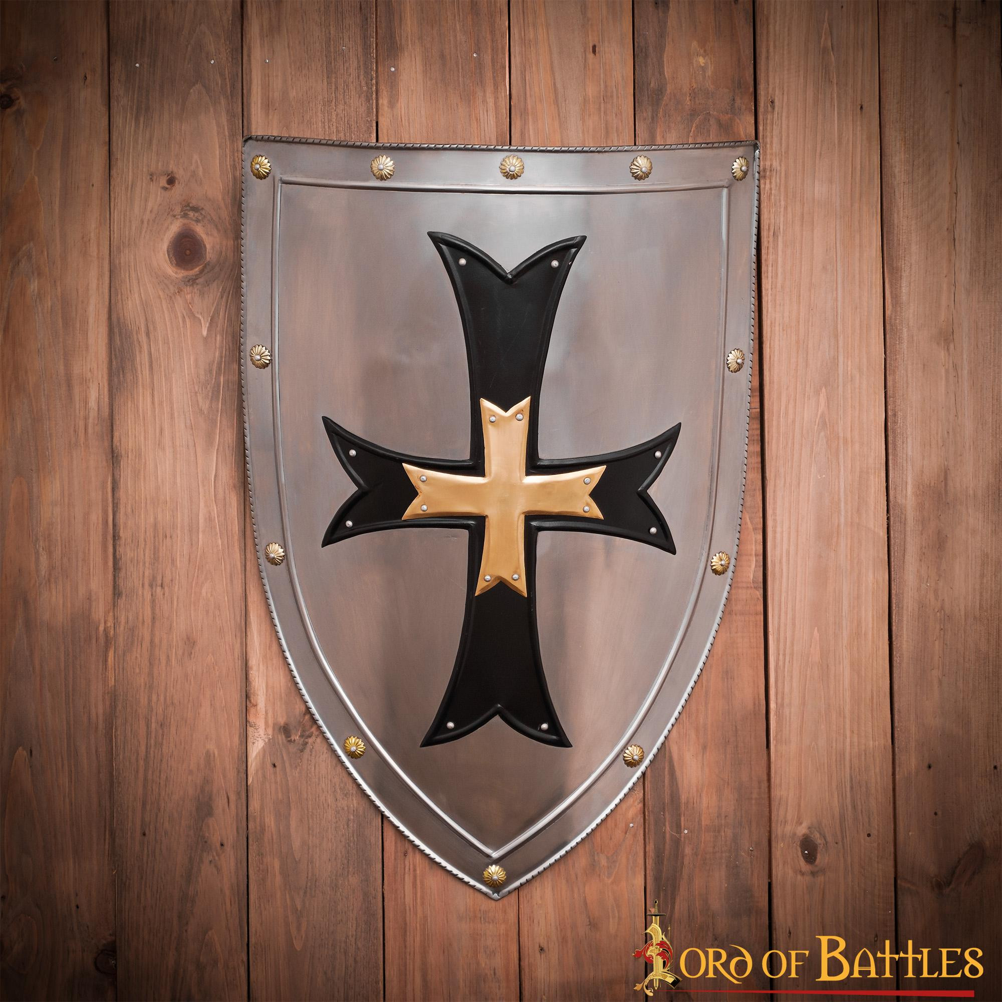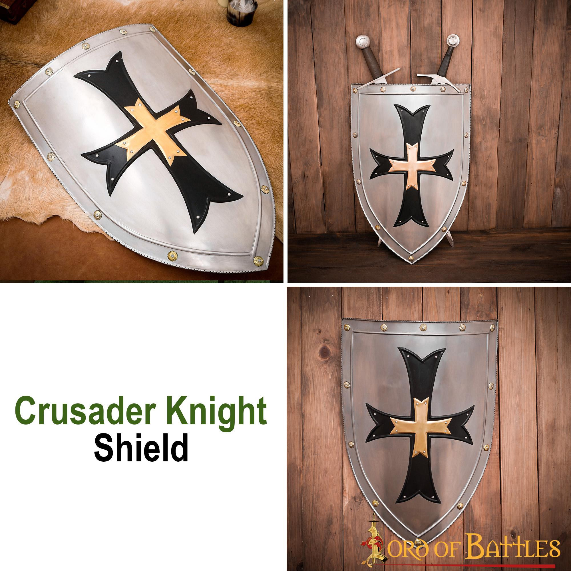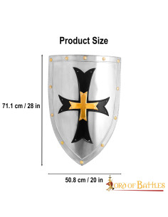 This Lord of Battles brand shield is handcrafted from 18 gauge mild steel ensuring durability and strength. With its dimensions of 28 X 20 inches, it is bigger and more robust than any of the fragile replicas available on the market. Additionally, the cross is embellished with a pure solid brass cross in the center, giving it a richly detailed look.