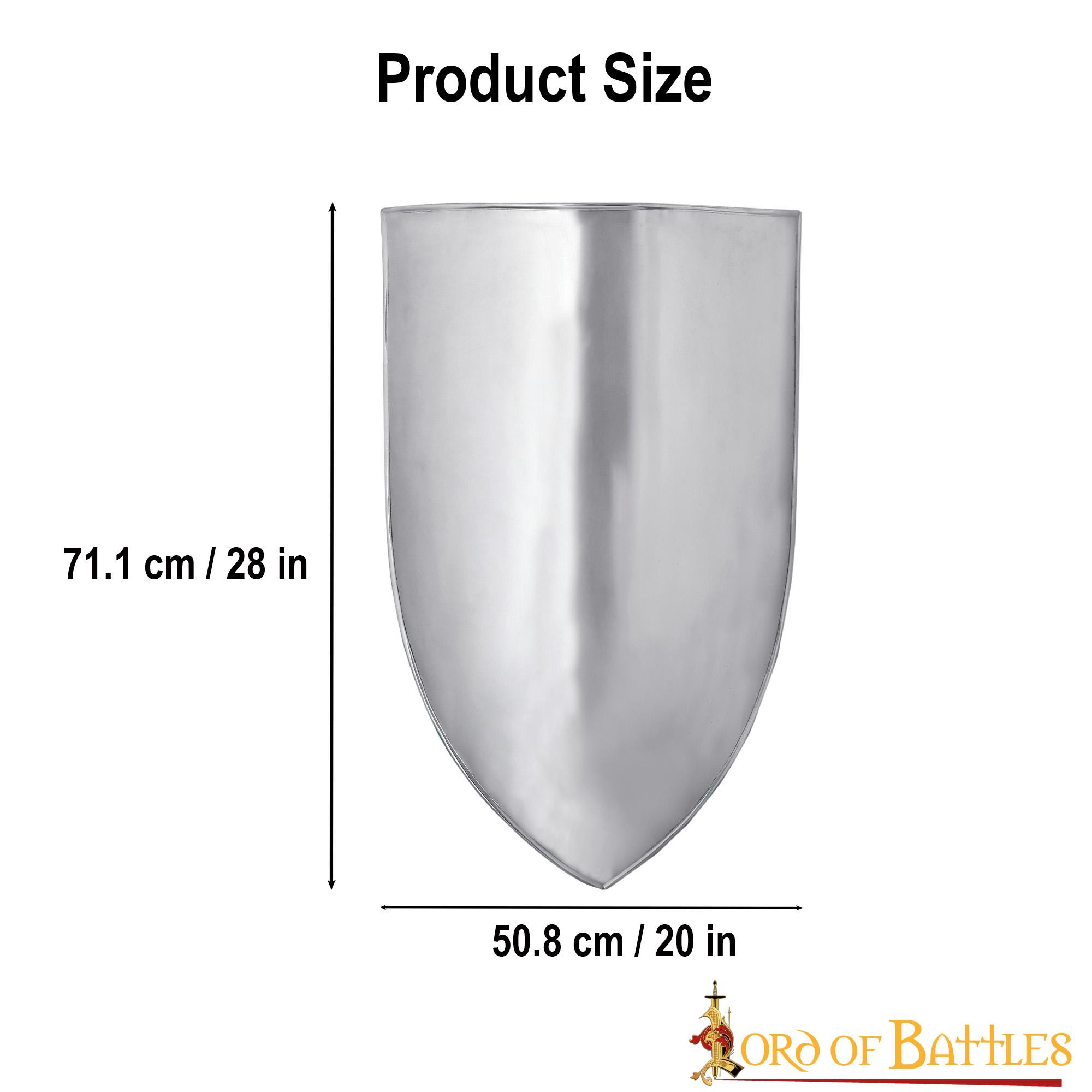Manufactured by the renowned Lord of Battles brand, this shield guarantees superior and long-lasting quality. Its main material is steel, which makes it a resistant and authentic piece. Standing at 28 inches tall, this shield offers a commanding, realistic presence that will impress history enthusiasts and lovers of themed decor alike.