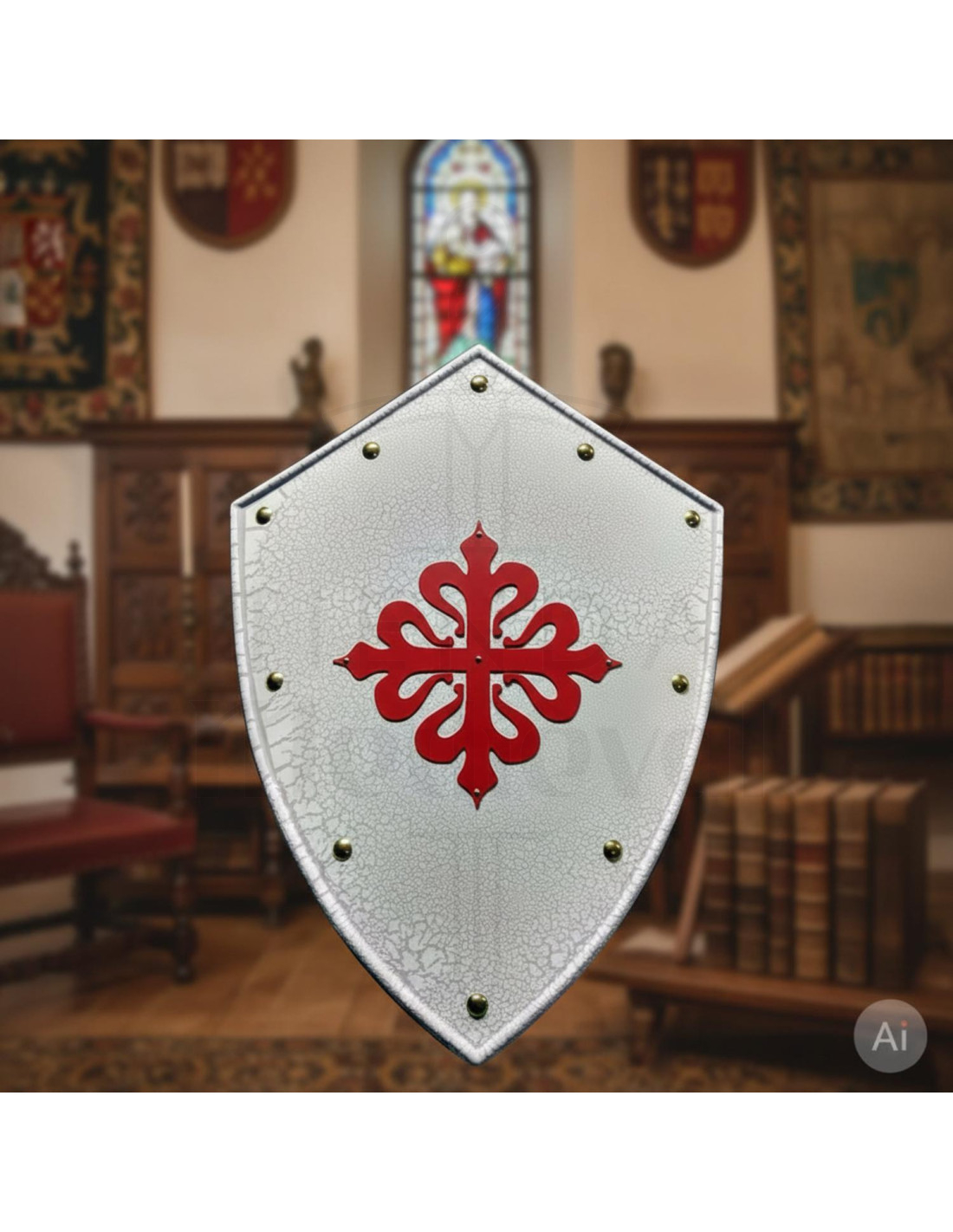 Discover the Calatravos Knights Cross Shield, a unique and exclusive piece that cannot be missing in your collection! This shield is made of high-quality iron sheet and has been hand-decorated with the Craquelé technique, which gives it an authentic appearance and full of history.