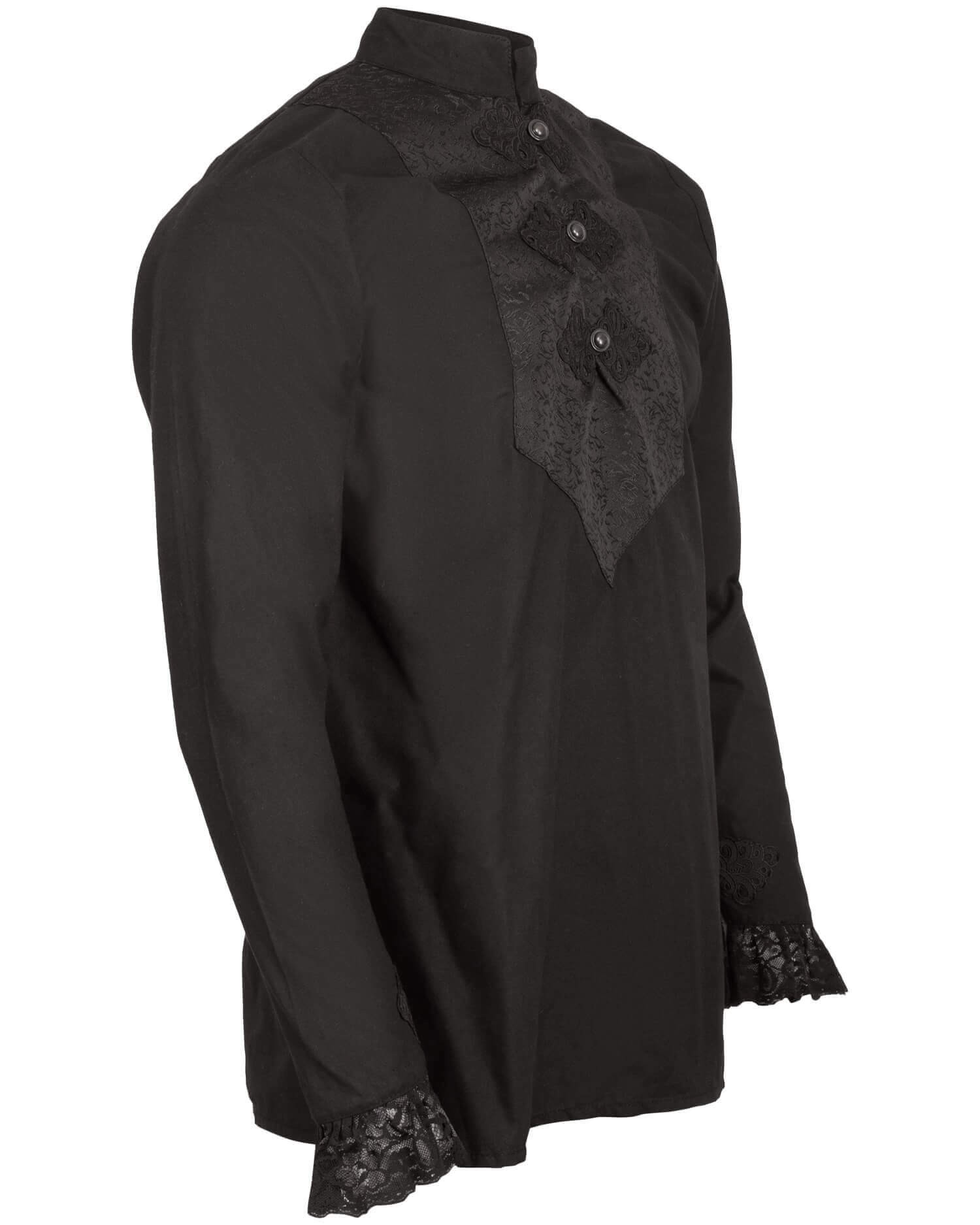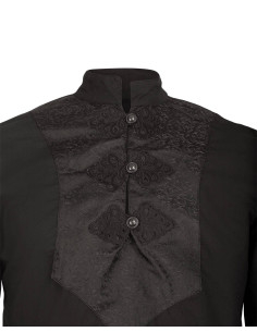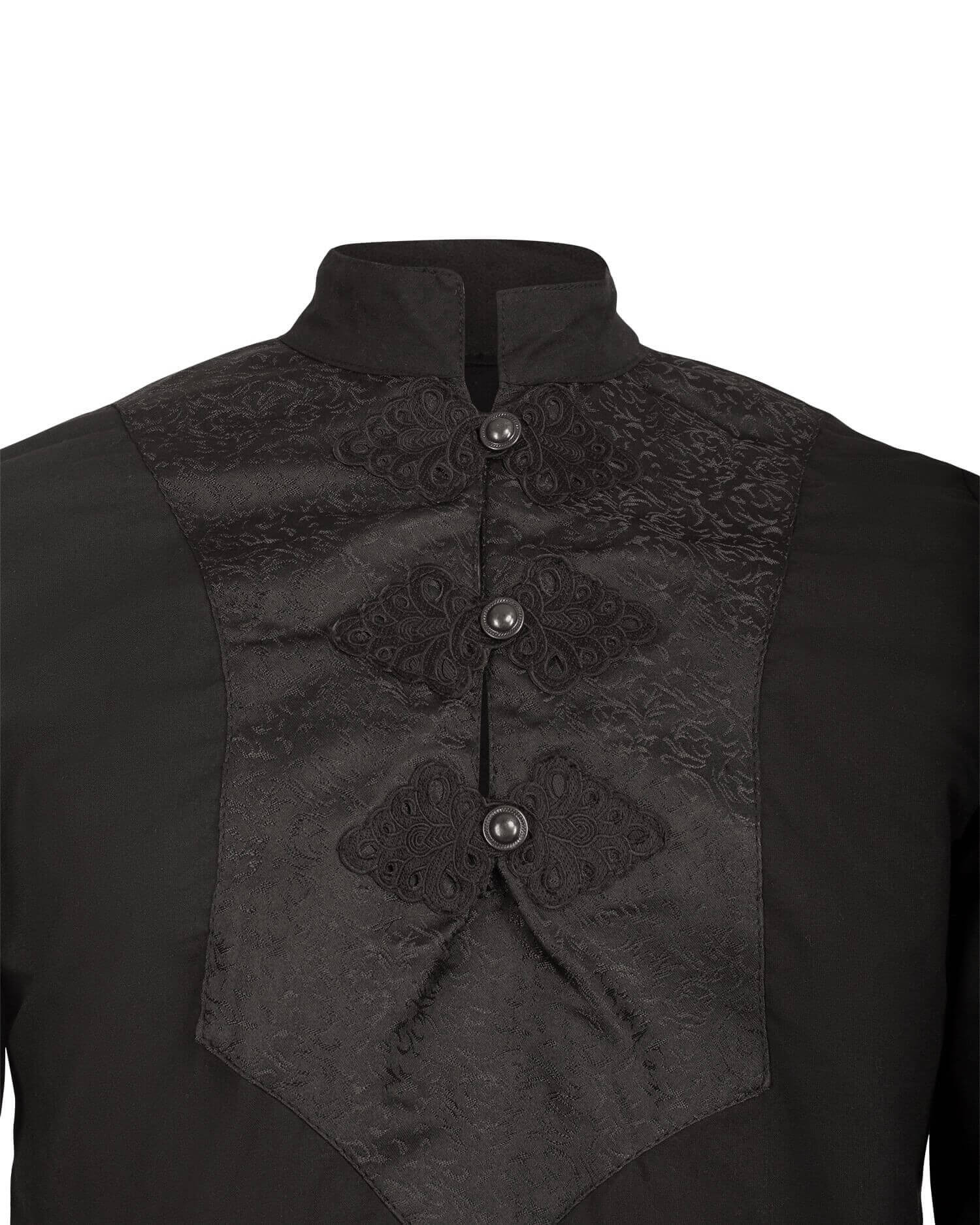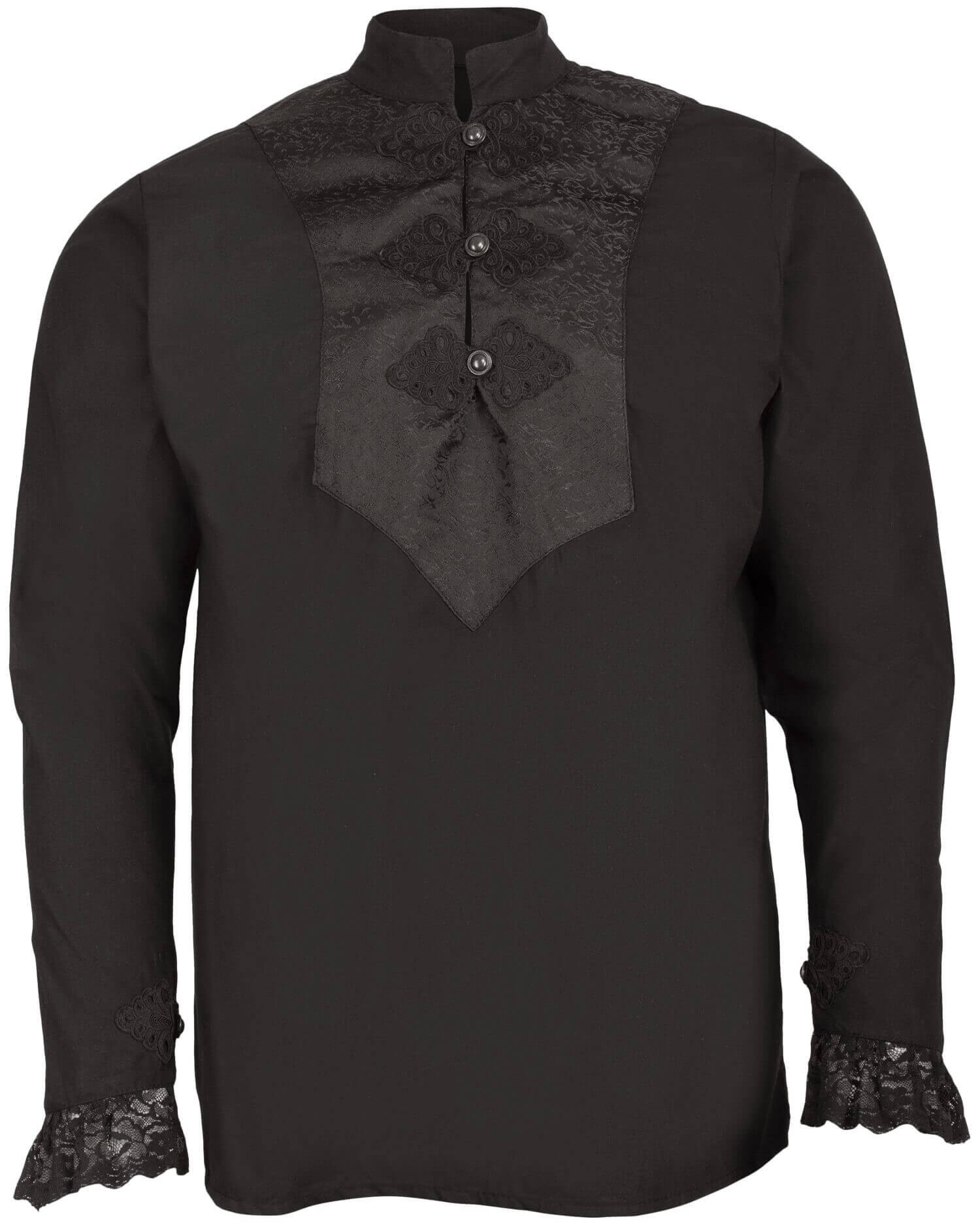 What truly stands out in this shirt are its high-quality embellishments. The chest is decorated with intricately woven damask brooches, while the sleeves feature a delicate lace trim, adding a touch of elegance. The metal buttons on the chest allow you to adjust it to your liking: you can choose to wear it with the collar open for a more casual style or button it up completely for a more formal and sober look.