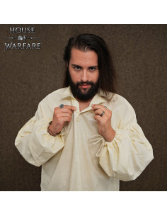 Its design, inspired by early and late medieval times, combines functionality with aesthetics. The detailed fabric-covered buttons on the collar and the sleeves with adjustable laces ensure a comfortable and practical fit, allowing you to regulate the opening and closing according to your preferences. Small pleats on the shoulders add a subtle touch of volume, achieving an authentic and relaxed look.