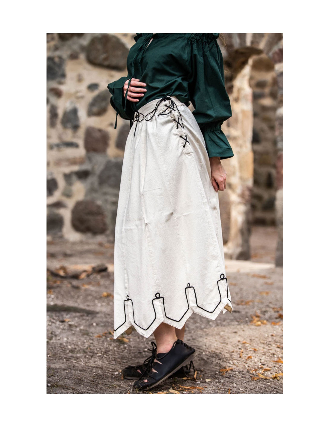 Welcome to our online store! Today we present you our magnificent Svenja medieval skirt with embroidery, which is available in raw white. This garment is perfect for lovers of medieval times and theme parties, since its design and materials are completely faithful to the time.