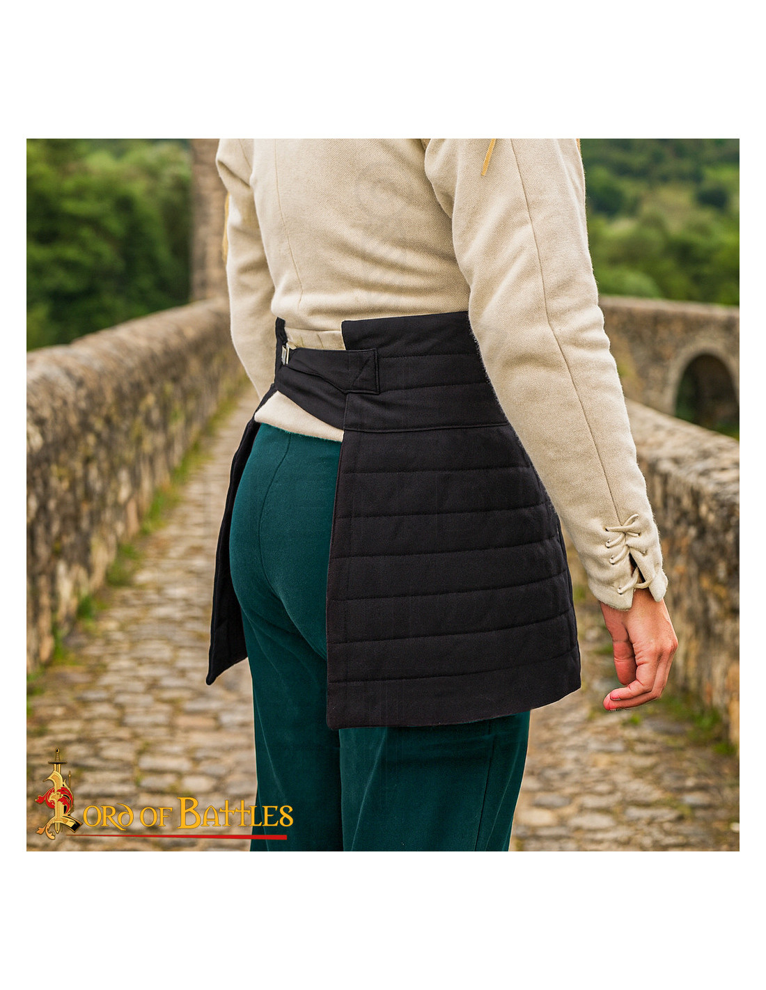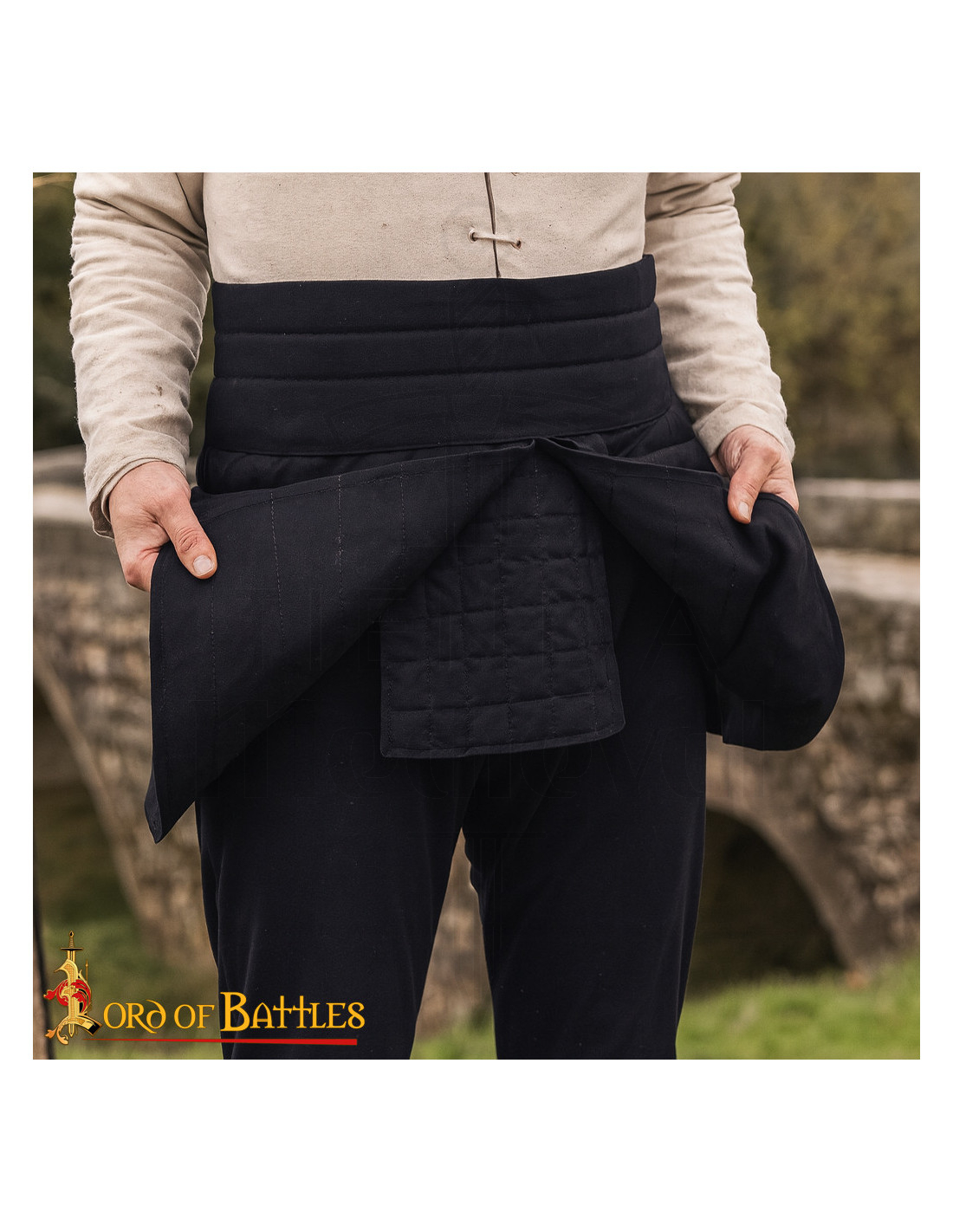 The visual aspect matches the image: a black wrap with horizontal stitching, curved at the waist, and a strap with a metal ring for closure, designed to be worn around the waist discreetly and firmly. If you're looking to buy the Black Cotton Padded Medieval Skirt, you'll get a versatile and practical solution for your battles and recreations.