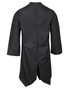 Are you looking for a garment that transports you to a world of fantasy and elegance? This long Arantir model tunic in a deep black is perfect for bringing mythical characters like elves, wizards, or priests to life. Its design combines simplicity and sophistication, making it stand out above all in any setting. The wide open sleeves add a flowing touch and allow total freedom of movement, ideal for dramatizing every gesture. The length up to mid-thigh and its relaxed cut ensure comfort and style without complications, while its soft high collar with discreet buttoning adds a touch of subtle refinement.
