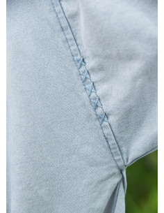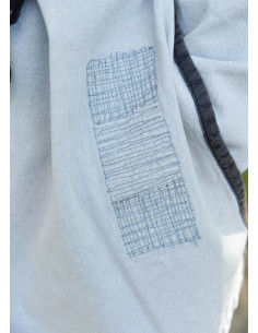 Details such as side openings at the hem and sleeves, with contrasting trim, along with visible repair stitches, reinforce its aesthetic of an ancient noble warrior. The adjustable opening with a metal cord not only provides functionality, allowing a comfortable fit, but also adds a decorative touch reminiscent of medieval times.
