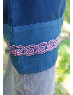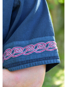 Its V-shaped neckline with an opening, decorated with braids in red and dark gray tones, adds an elegant touch without losing that warrior essence. The craftsmanship in the details, such as repair stitches on the collar and hem, reflects its durable character. The short, wide sleeves, adorned with braided patterns inspired by Celtic culture, offer full freedom of movement, ideal for re-enactments, LARP, or medieval fairs.