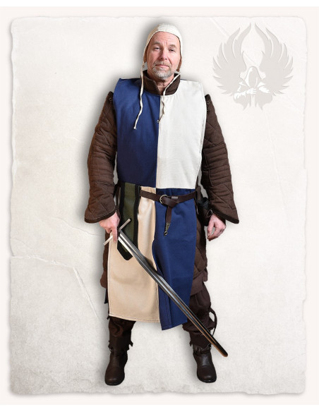 It fits over a shirt or quilted clothing, pairing perfectly with a leather belt, hood or hat, and tall boots, to create a coherent look at themed events. If you're looking to buy the Medieval Square Tabard Model Anton in Blue-White, you'll have a practical, durable piece with a clearly identifiable character, designed for those who value both comfort and historical aesthetics.