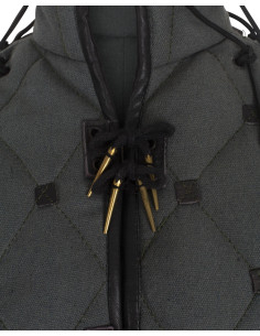 This gambeson includes four metal grommets on the shoulders, specifically designed for you to easily add leather or metal shoulder pads, customizing your gear according to the type of battle or event. The front closure is reinforced with leather and adjusted with metal-tipped laces, allowing it to fit perfectly to your body, ensuring comfort and security.