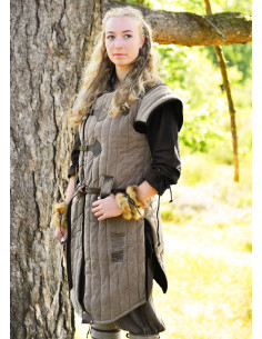 Are you looking for a garment that combines history, durability, and authentic style for your medieval reenactments or cosplay? This Vari gambeson in brown and black tones with a worn finish is exactly what you need to look like a true warrior from the past.
