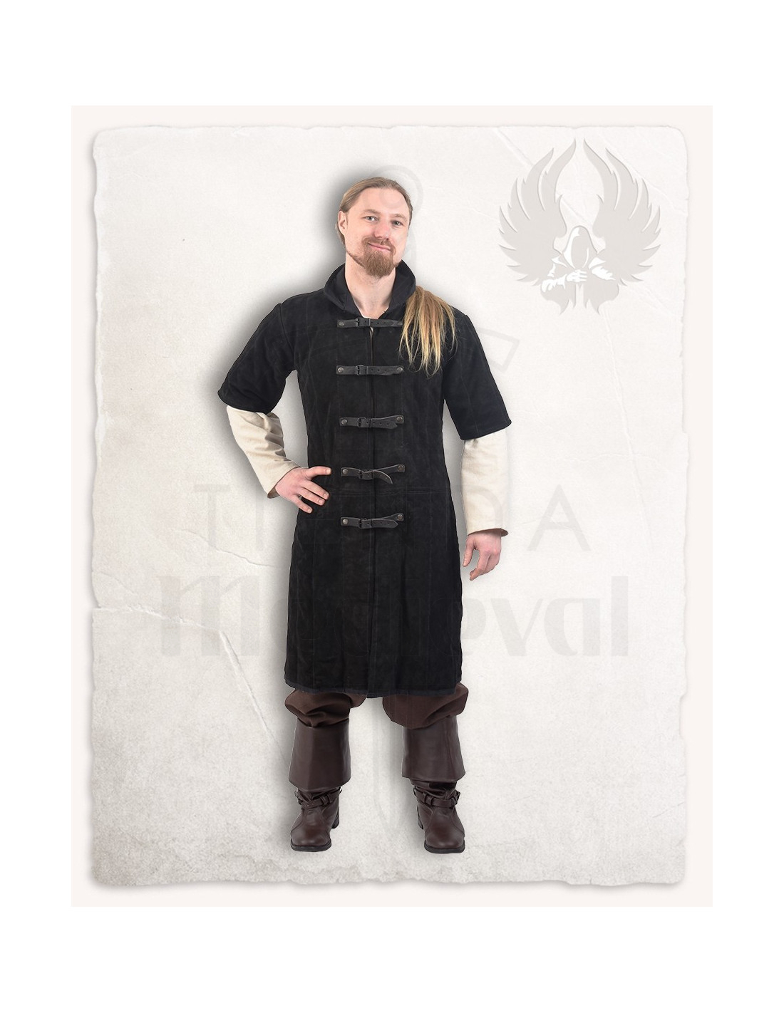 Additionally, its sober and stylish aesthetic, with a design reaching mid-thigh and a high Mandarin collar, gives it a distinctive touch that captures the medieval essence in a functional and modern way.