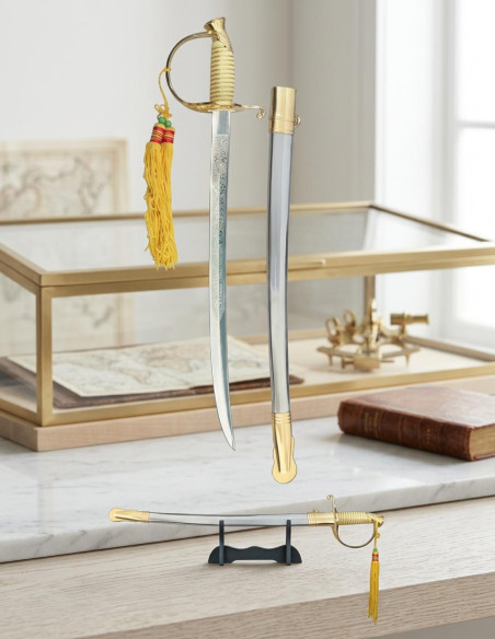 This miniature sabre is your ally for creating a solid presence. With a handle in ivory imitation and yellow tassels, it conveys exclusivity and respect. The metallic sheath and stand allow you to show it off with pride, reinforcing your leadership and sense of authority. It is more than a decorative object: it’s your proof that you control your space, value tradition, and pursue perfection in every detail at all times. The American Sabre Miniature is designed for you to take command and project that strength you want to share with the world.