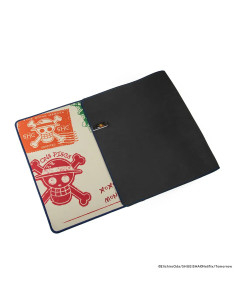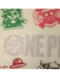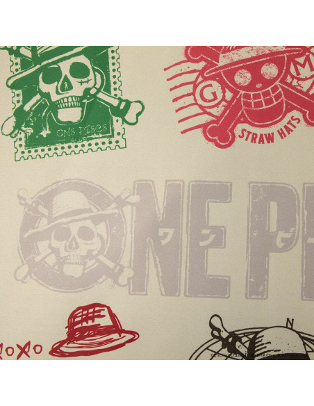 This piece captures the essence of the Straw Hat with a pattern of stamps and skulls in red, green, blue, orange, and yellow, arranged over a light background that brightens up the space. The dark border frames the design, creating an elegant contrast that highlights the nautical motifs and iconic phrases inspired by the series.