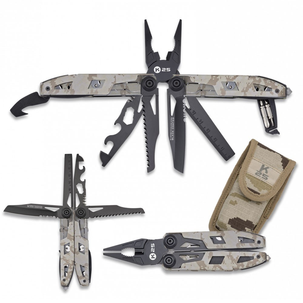 Prepare for any situation with the K25 Tactical Plier with 17 different uses! This versatile multi-tool plier gives you a complete solution in one tool. With a coyote color finish, it stands out for its strength and durability. In addition, it comes with a cover for safe and practical transport.