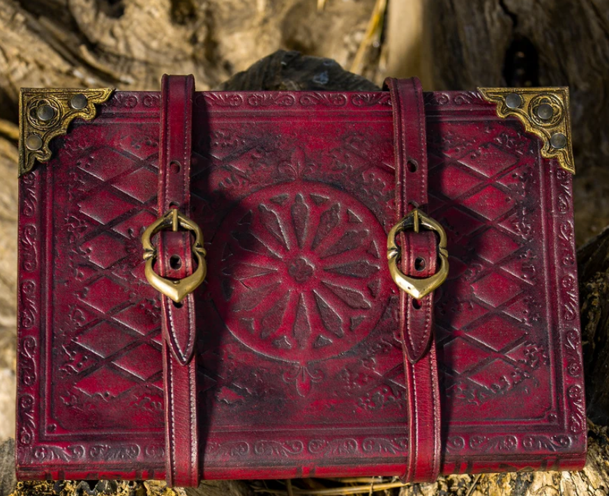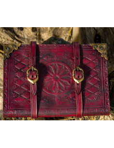 Discover the 'Spellbook Grimoire', a handcrafted book from 'El Marqués de LARP', created for those seeking a touch of magic and mystery in their daily lives. Made entirely by hand, it features high-quality leather covers and a unique engraving that stands out for its mystical and detailed design, with geometric patterns and a central rosette emblem that encapsulates its supernatural essence. The leather straps with metal buckles not only protect it but also add a perfect rustic charm.