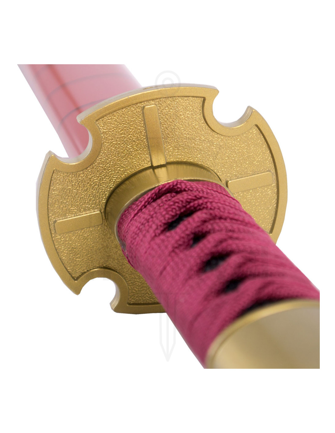 The burgundy wrapped handle, combined with black ray imitation leather, not only provides a comfortable and firm grip but also reflects the traditional and distinctive style of the Sandai Kitetsu. The choice of colors and the burgundy wrapping emphasize the dark and powerful character of the katana, while the black ray imitation leather adds a touch of elegance.
