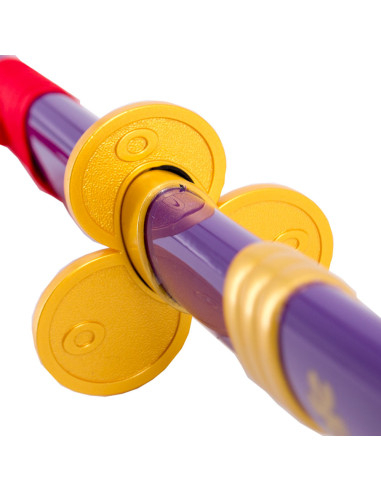 The katana features a bamboo blade of 270 mm, standing out for its design faithful to the original, with a plastic sheath and handle, as well as a plastic tsuba that reflects the characteristic details of Zoro's sword. The piece has a dark-toned finish, with black and gold details to add realism and authenticity to the design.