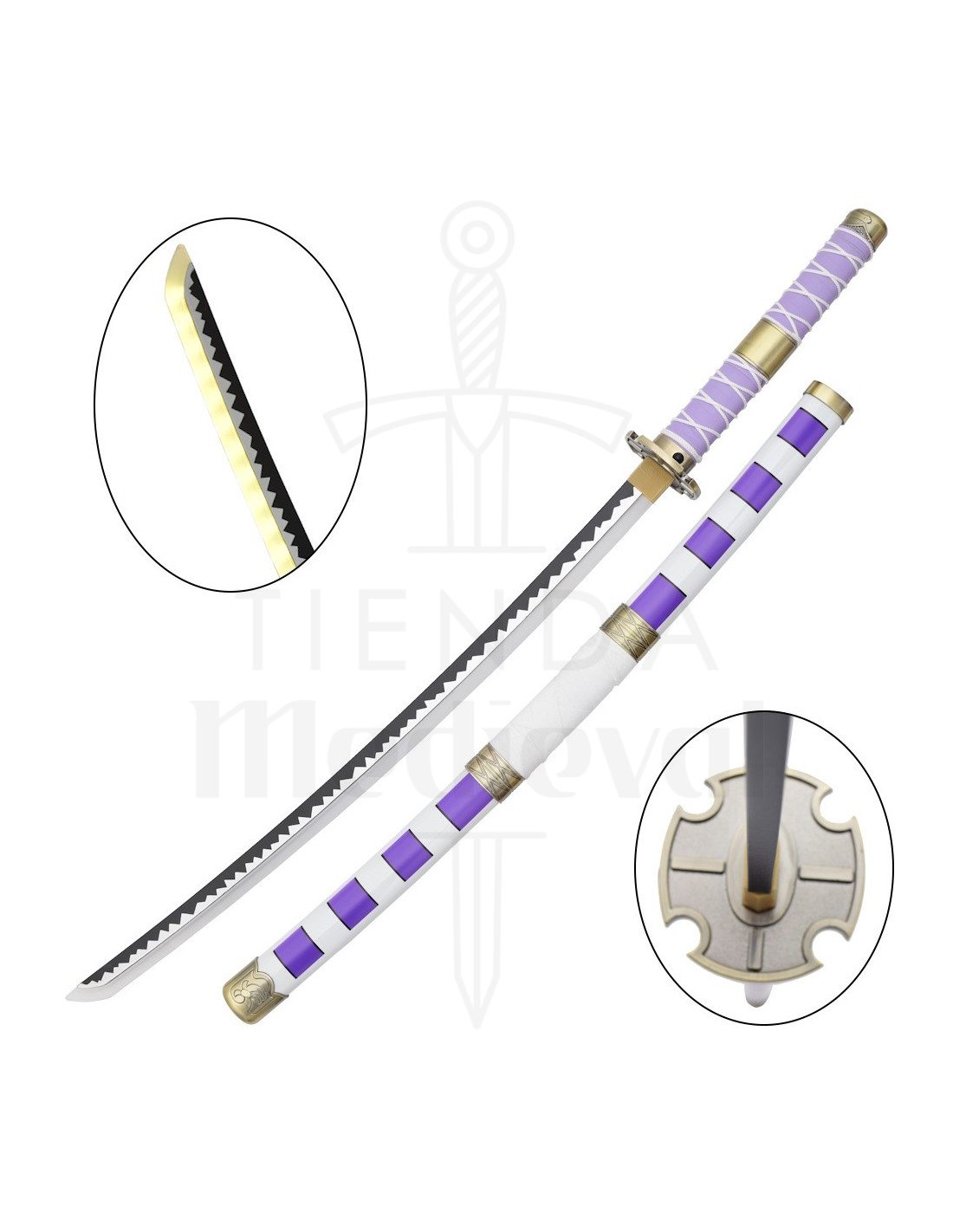 This ornamental katana is not only a visual tribute to the series but also stands out for its bamboo finish, giving it an authentic and elegant look. The blade, with a serrated design and a finish in dark tones with golden details, captures the essence of adventure and the fighting spirit of the protagonist. The handle, wrapped in white material with purple details, provides a comfortable and secure grip, ideal for displays or collecting.
