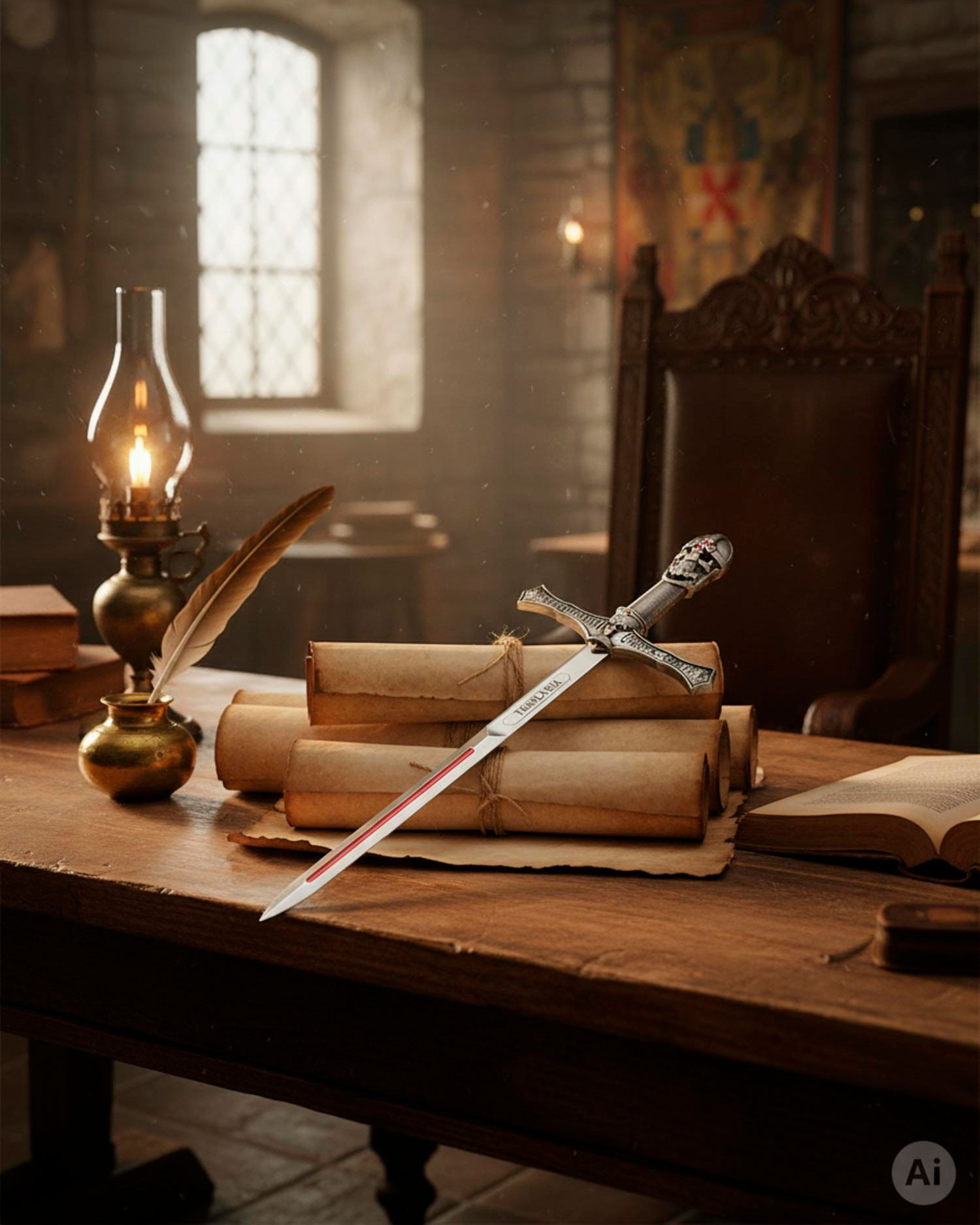 The pack includes a fantasy Templar stand, designed with a metallic silver finish and embossed details that evoke medieval armor. The skull on the helmet and the red cross on the front give it a gothic and symbolic style that stands out. With a height of 7.2 cm, it is compact and practical for holding the sword, a letter opener, or small objects, keeping your desk organized with a dark and spectacular air.