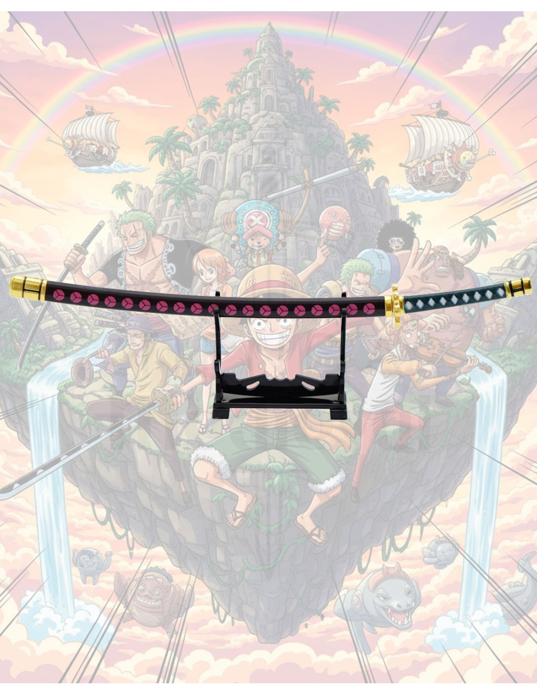 The mini katana replicates the aesthetic of Zoro's Shushui with a finish that combines black, pink, blue, and gold, creating a striking contrast that instantly captures attention. The blade design features pink detailing, and the scabbard decorated with aligned symbols adds presence, while the rectangular guard with a golden edge provides an elegant and distinguished air.