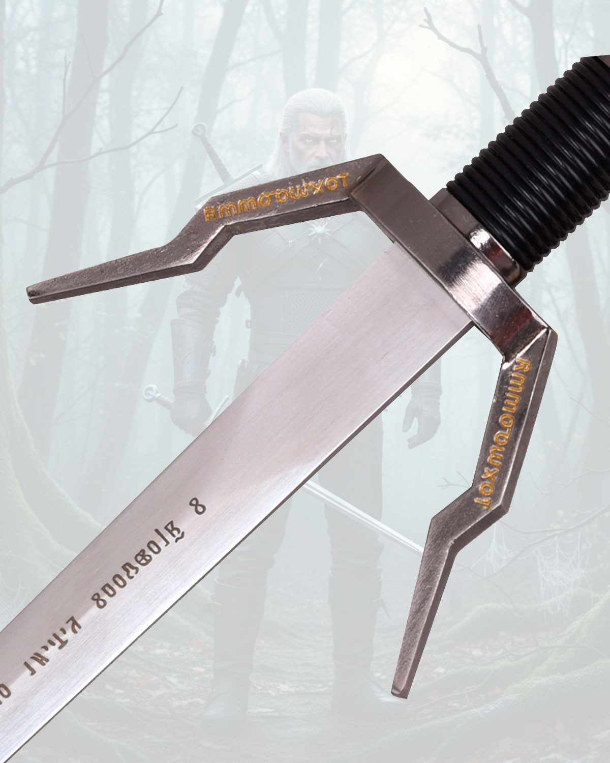 The steel blade features a straight, sharp point, adorned with engravings and symbols that tell stories with every glance, making contemplation an almost narrative experience. The guard, with its ends curving upwards and finished in nickel, adds a distinguished silhouette that seems to emerge from the pages of the Witcher's universe.