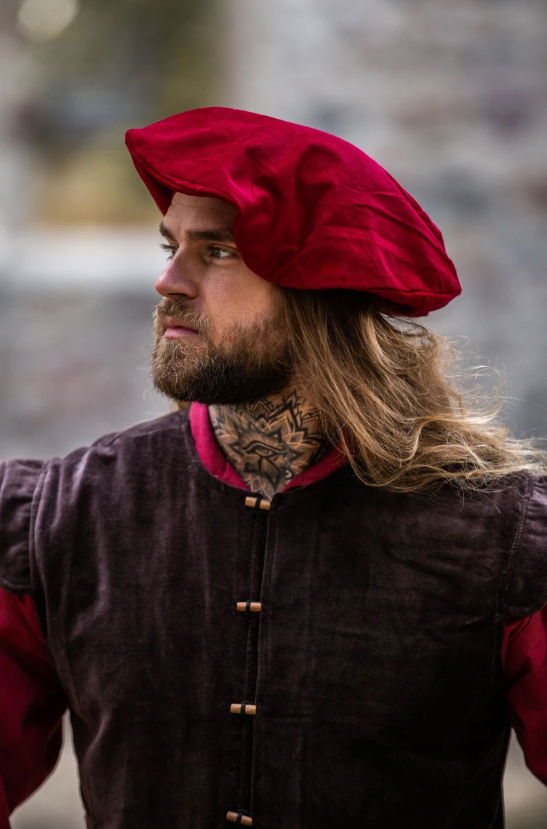 This Parlota is perfect for those lovers of Renaissance fashion who are looking for a quality garment tParlota will last them for many years. Add the Kurt red cotton Renaissance-style Cap to your wardrobe and surprise everyone with your unique and elegant style!