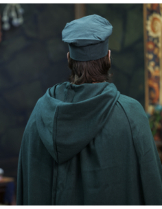 The image shows how the hat pairs well with a short cloak and a light tunic, creating a harmonious ensemble: the slightly rough texture of the garments suggests authenticity, while the metallic closure and cord add small functional details that complement the whole. This visual coherence makes it easy to put together a complete outfit for fairs, performances, or photo sessions.
