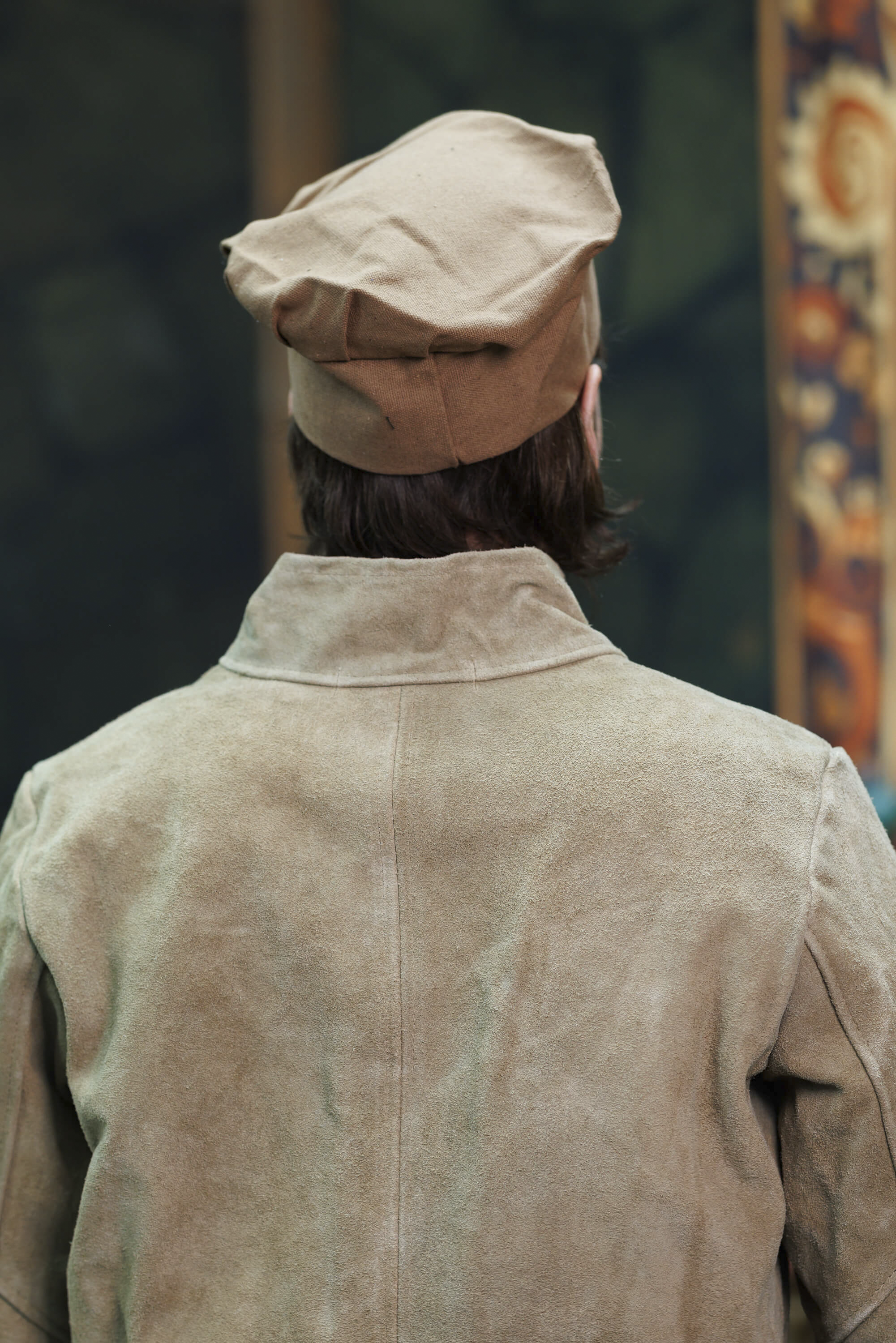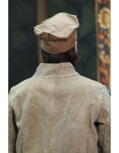 The image shows how the hat harmonizes with an upper garment in the same sand tone, with a texture similar to suede and a cord closure, suggesting the possibility of creating a coordinated outfit with a marked artisanal and historical character. This combination enhances the finish and presence of the hat, ideal if you are looking for a refined aesthetic without flamboyance.