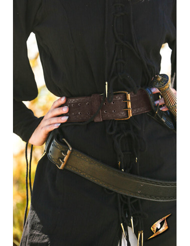 Are you looking for a belt that combines functionality and character in your adventures? This pirate belt made of suede, Model Hunter, offers a solid and authentic presence, perfect to complete your medieval, pirate, or fantasy look. Its finish in soft dark brown suede provides a worn and natural touch, ideal for those who appreciate stories of creatures that have traveled miles or characters bearing the passage of time in their attire.