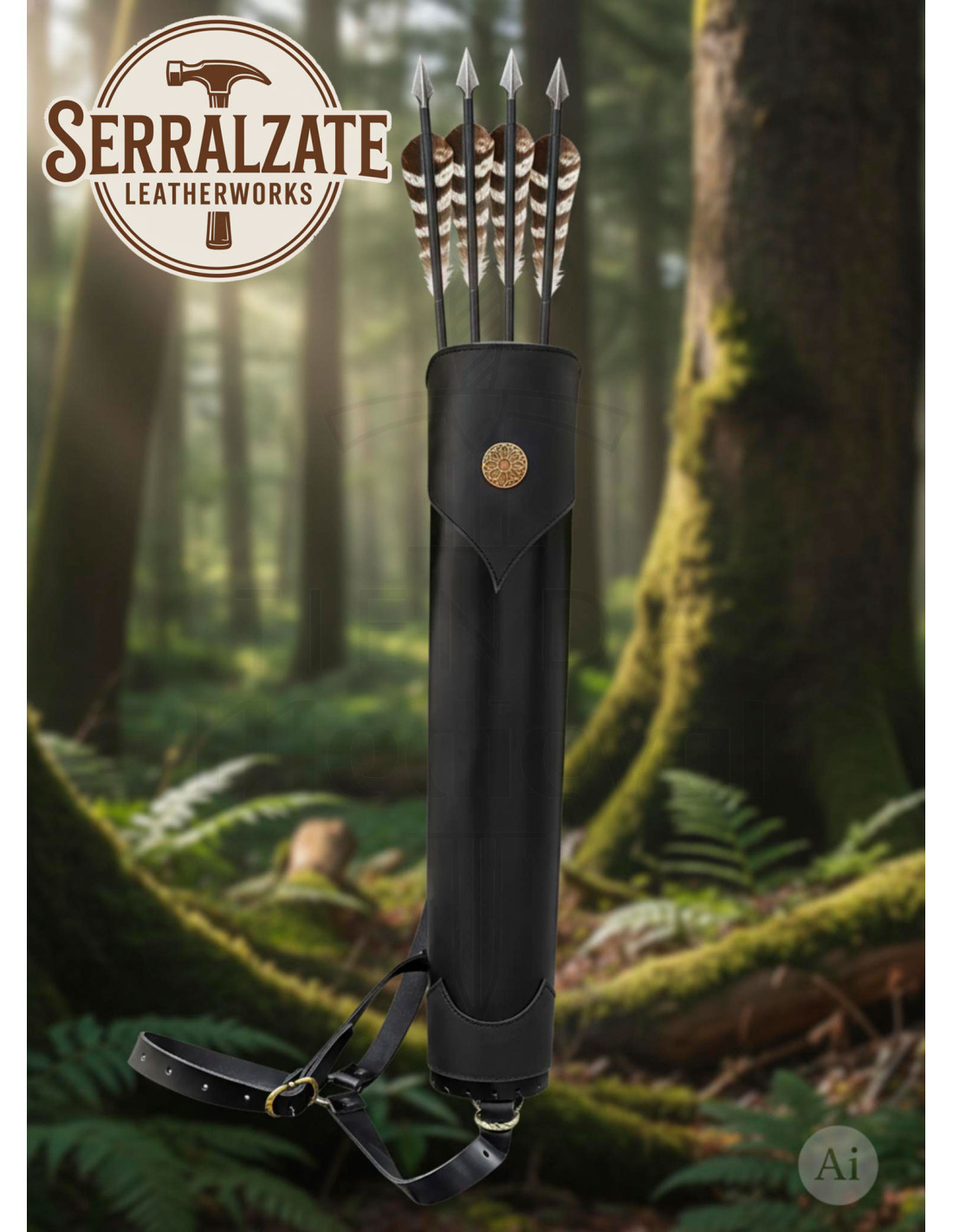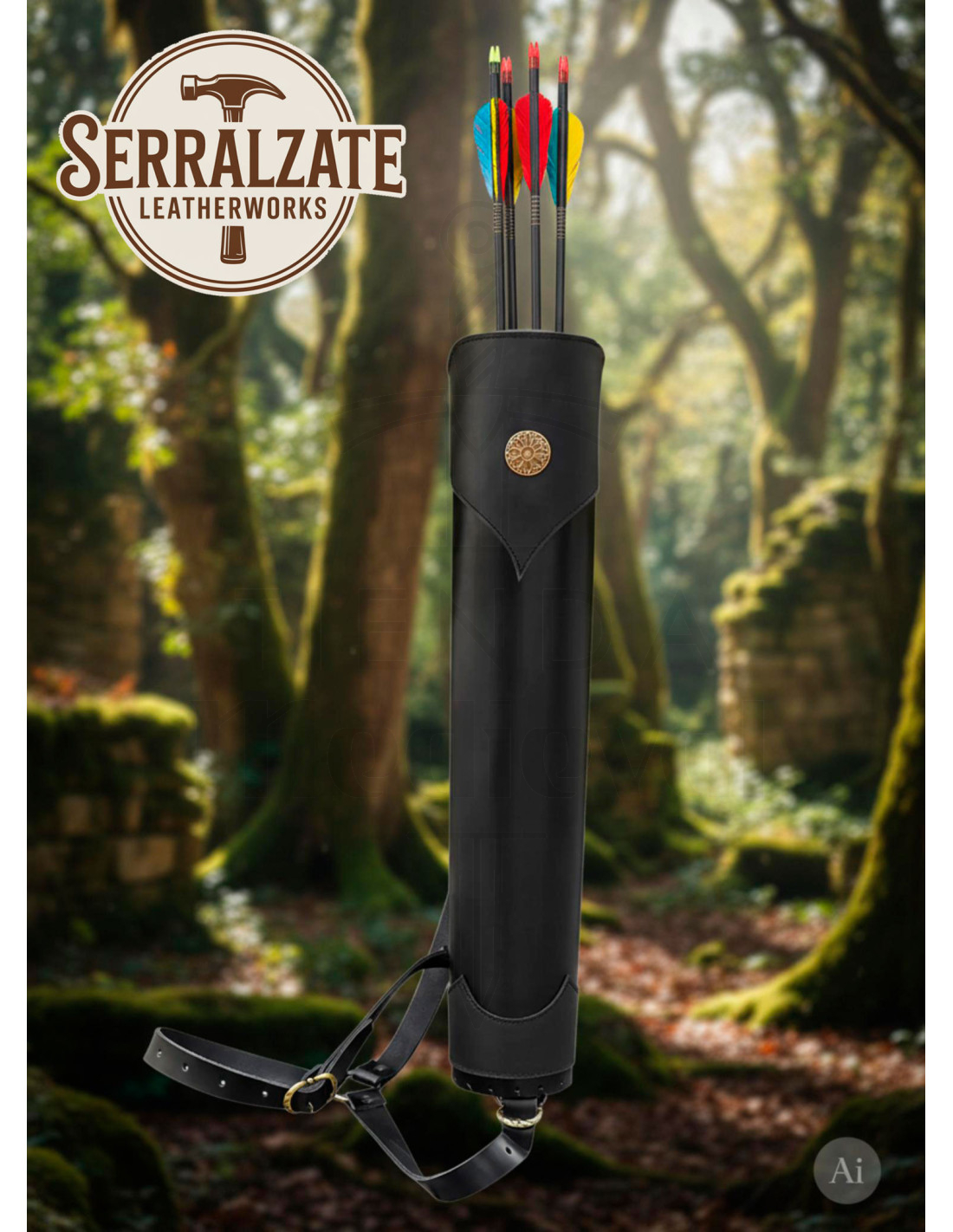 This genuine black leather back quiver is handcrafted in Spain using high-quality leather, offering a sense of sturdiness and durability that protects what you carry inside. Its stitched structure provides solidity, maintaining its shape and facilitating quick access to arrows, while the front metal decoration adds a touch of character that enhances any gear without compromising functionality. The adjustable strap with metal fittings ensures comfortable and stable transportation, adapting to various postures and allowing you to wear it for long hours with less fatigue.