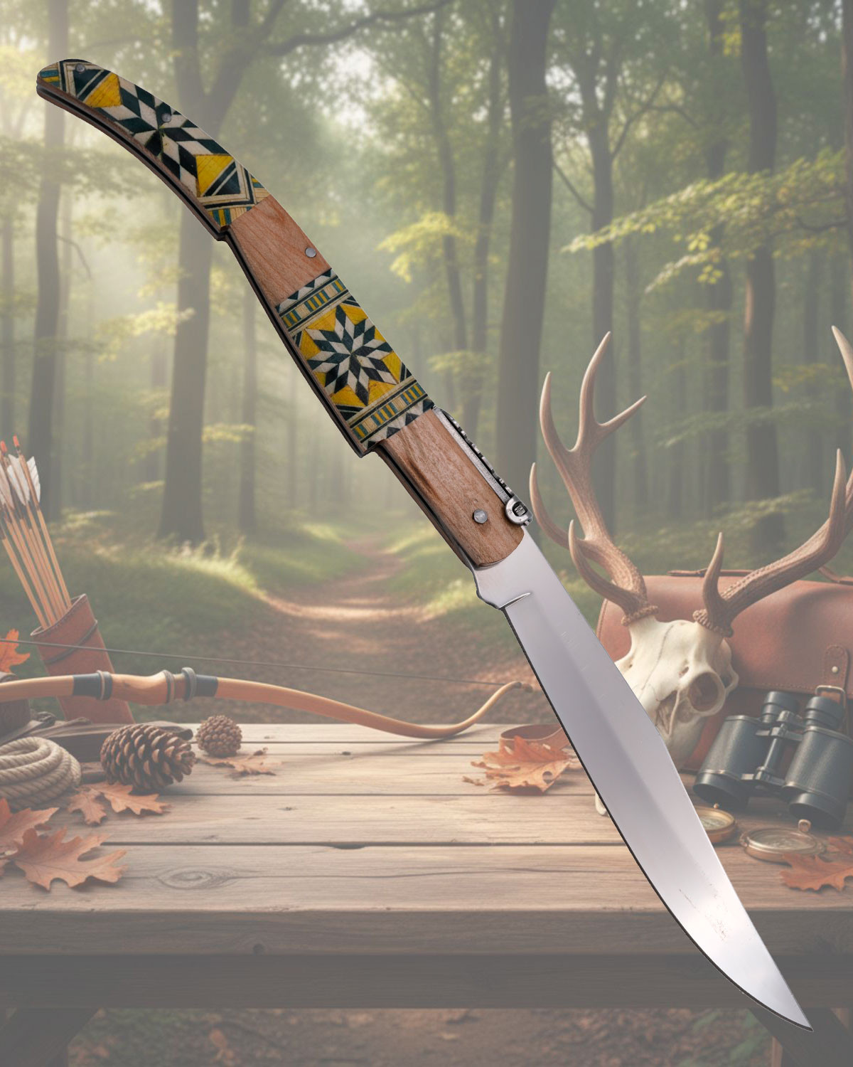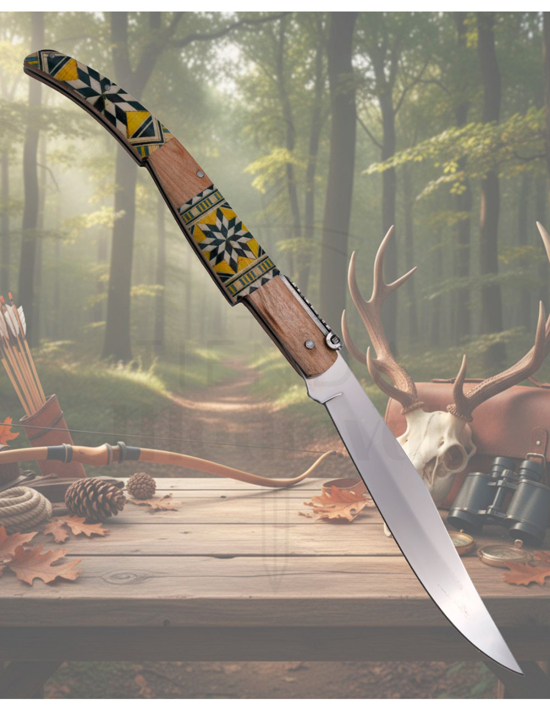 This model features precision CNC work and a finish that mimics marquetry, designed for those who value the combination of aesthetics and functionality. The Maple wood handle combines areas of light tone with decorative panels in yellow, black, and beige, creating an attractive contrast that draws attention without losing subtlety. The curved and ergonomic shape of the handle facilitates a natural grip, reducing fatigue and offering control with every movement.