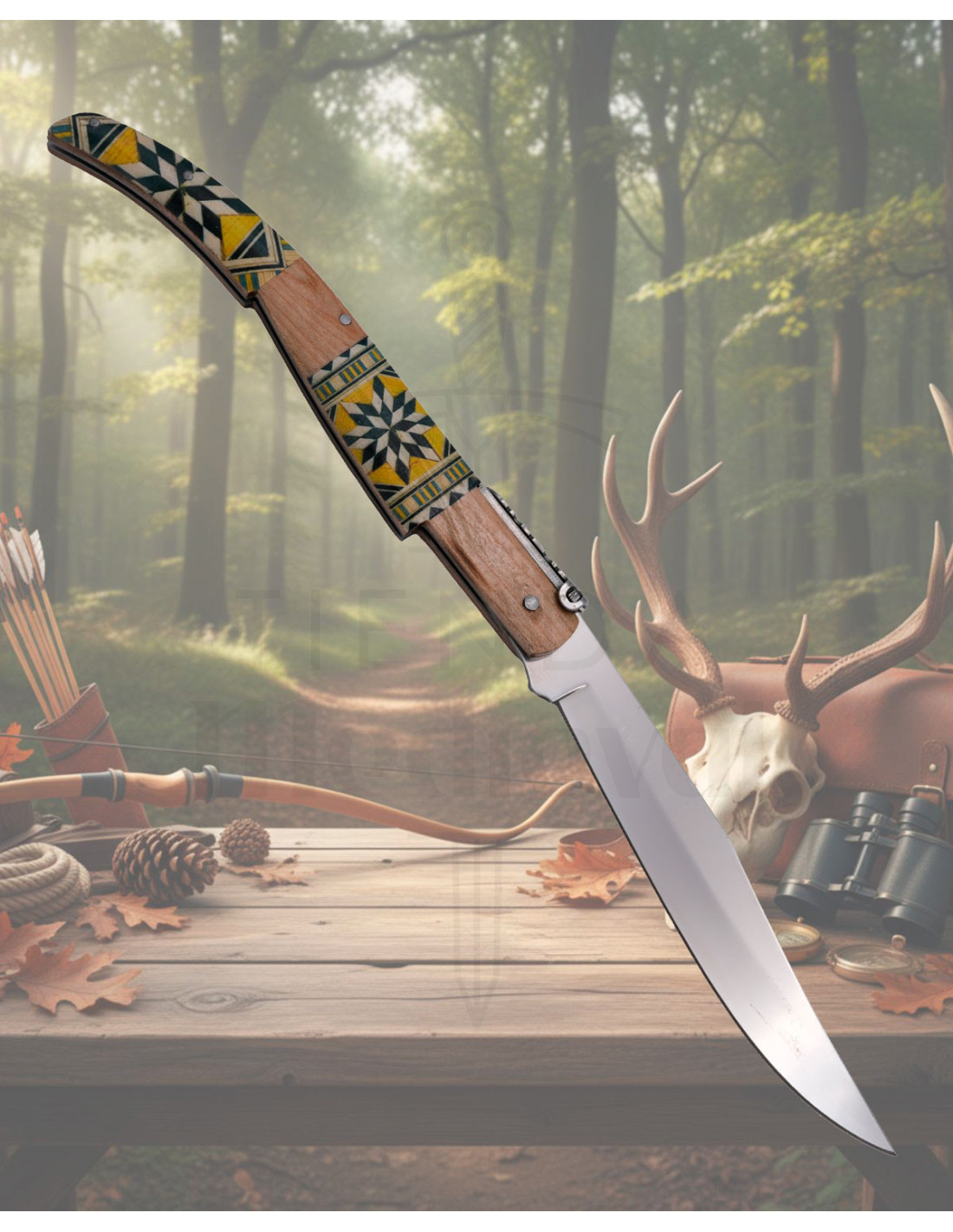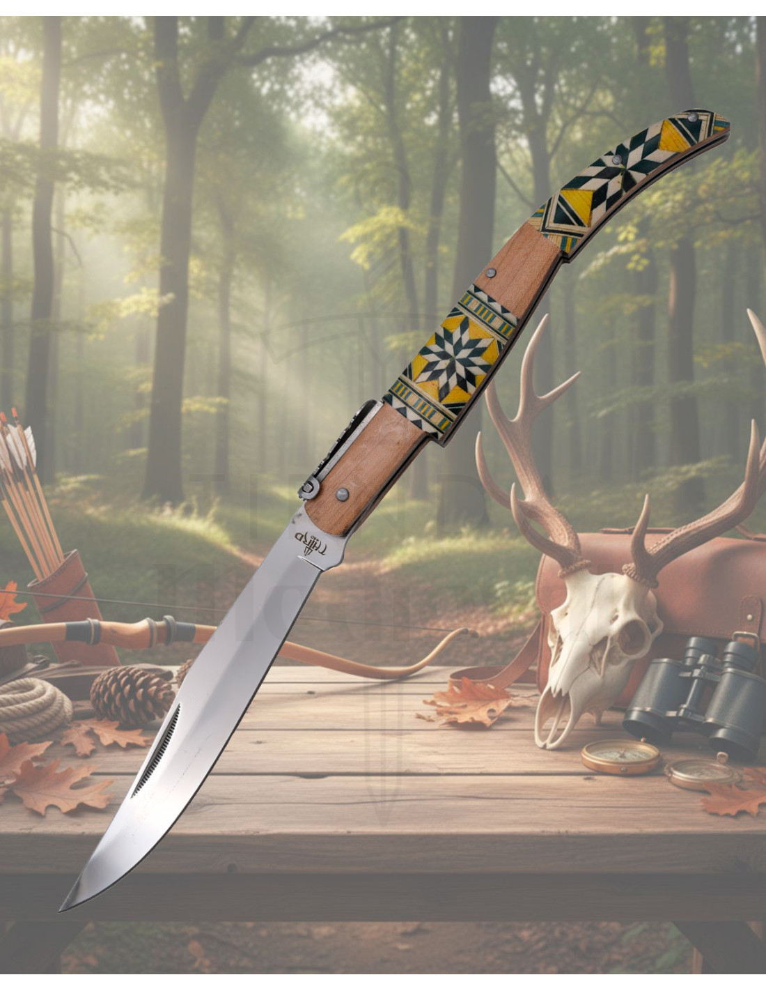 The Third ratchet pocket knife with inlaid Maple Wood handle features a careful aesthetic combined with functionality designed for everyday use and display. The handle made of Maple wood with a primer that mimics inlay work provides a warm and elegant feel to the touch, while the geometric pattern in black, white, yellow, and brown tones adds personality and a unique character. This combination transforms each grip into a comfortable and secure experience, thanks to its curved profile that fits the hand.