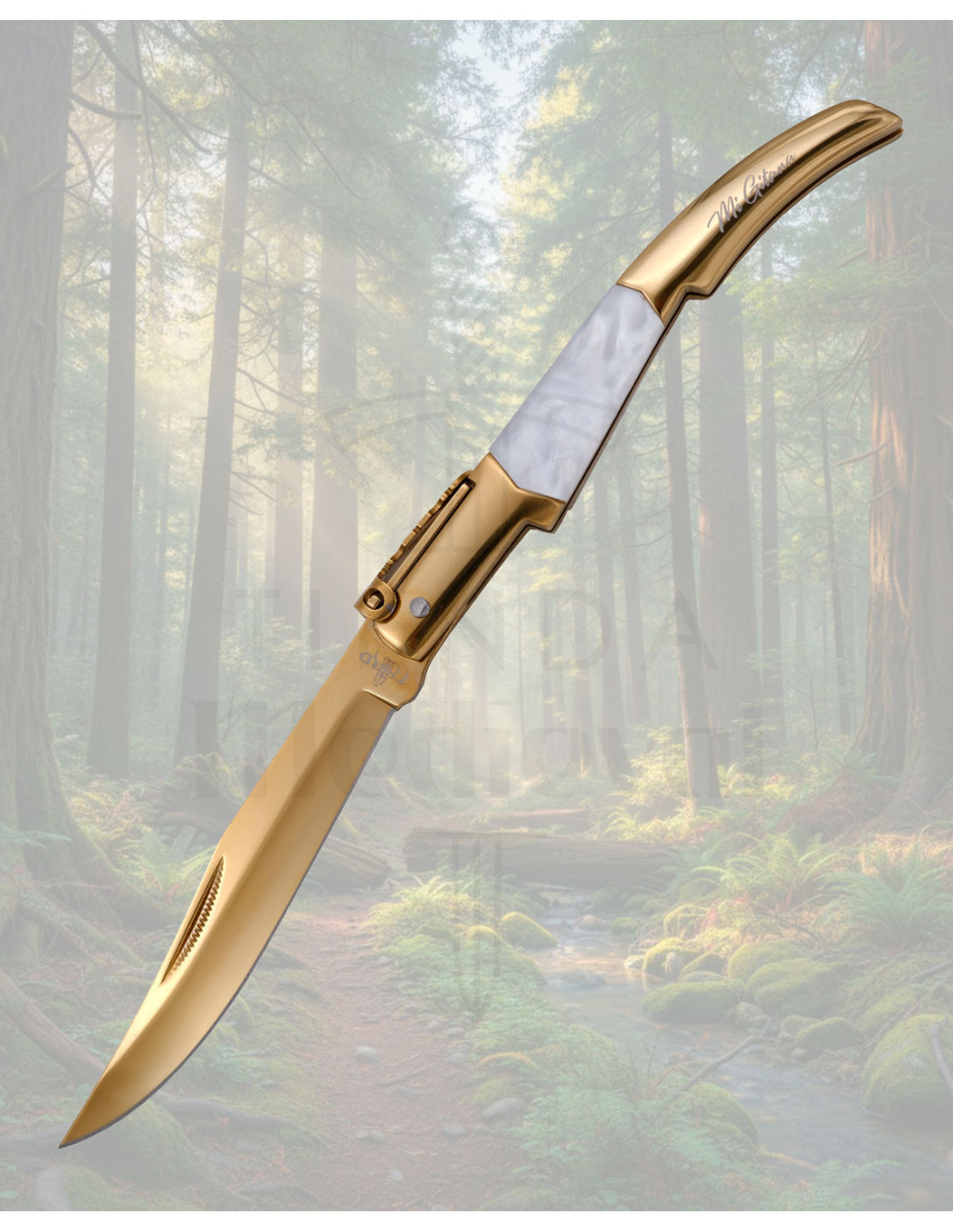 The Third Series Rack Knife My Gitana Gold offers a handling experience designed to feel natural and secure, thanks to its curved ergonomic handle that facilitates grip in any daily task. The contrast between the mirror-finish golden coating and the pearled white acrylic inlay adds a touch of distinction, making each use a statement of style.