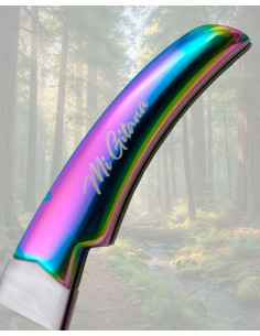 The curved blade tip with a small serrated segment facilitates precision cuts and detailed work without sacrificing versatility, while the mirror shine of the rainbow titanium coating enhances the appearance and protects the surface from daily wear. The curved handle with metallic bolster and acrylic insert provides ergonomics and a secure grip, creating a balanced feel in hand, comfortable for repetitive tasks and attractive when displayed.