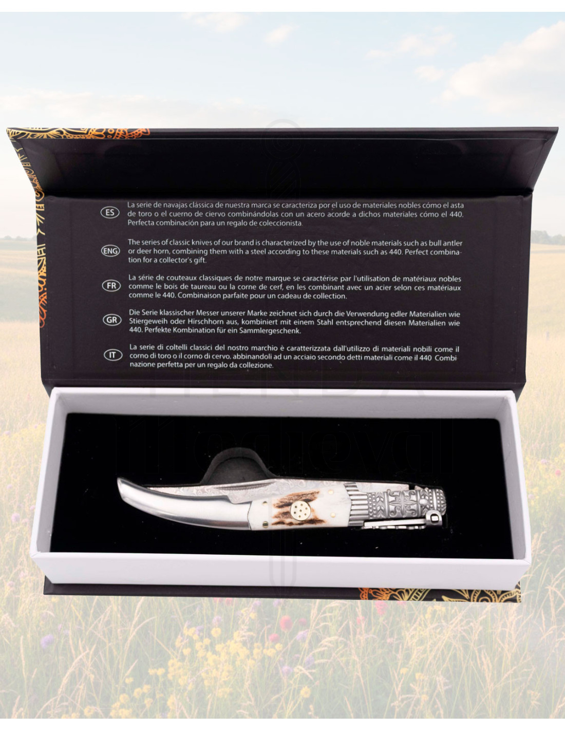 The handle, with authentic stag horn inserts and polished steel bolsters, provides a warm and unique grip, along with an elegant visual contrast. The natural grains of the stag horn and the decorative engraved metal base convey character and a classic aesthetic, perfect for those who appreciate pieces with history and good taste.
